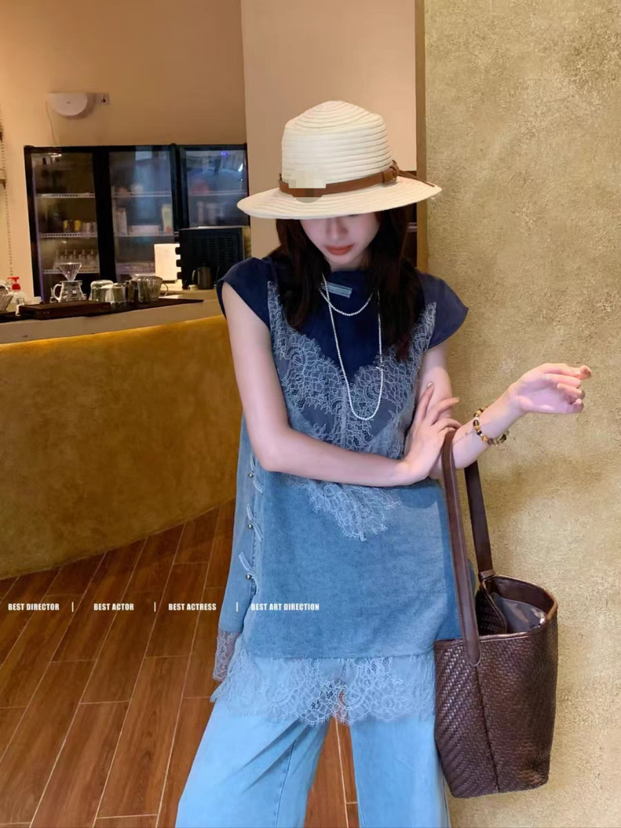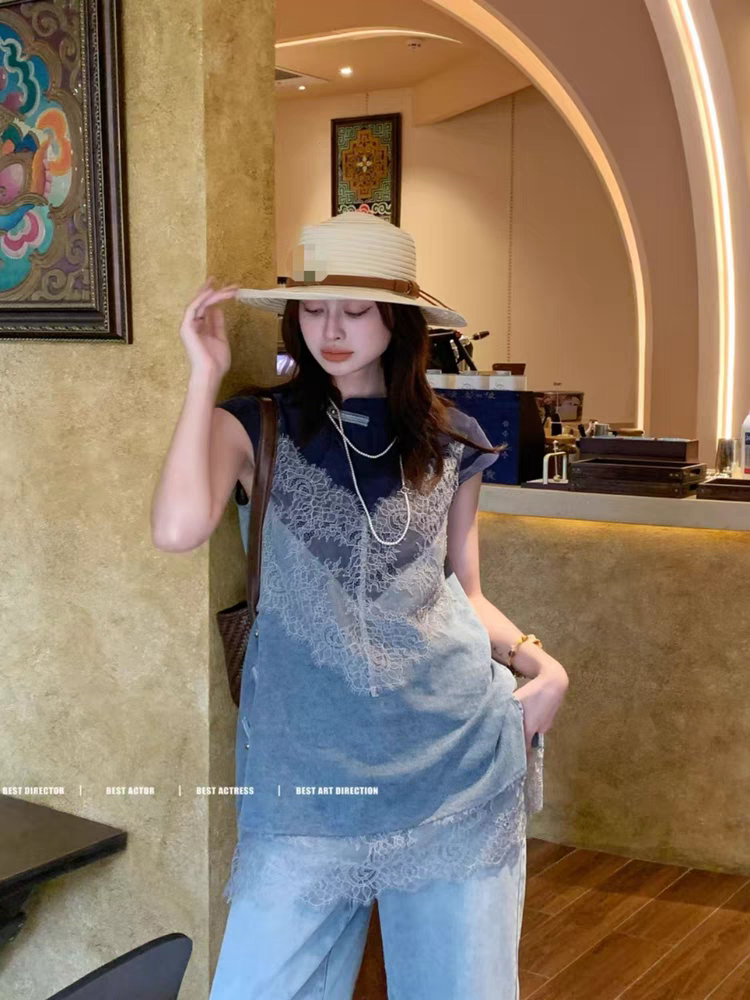 欧洲站2025夏季新款V+.com时尚圆领拼蕾丝中长款侧盘扣牛仔连衣裙