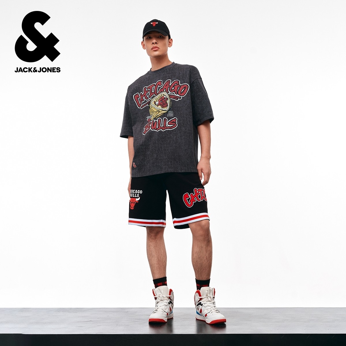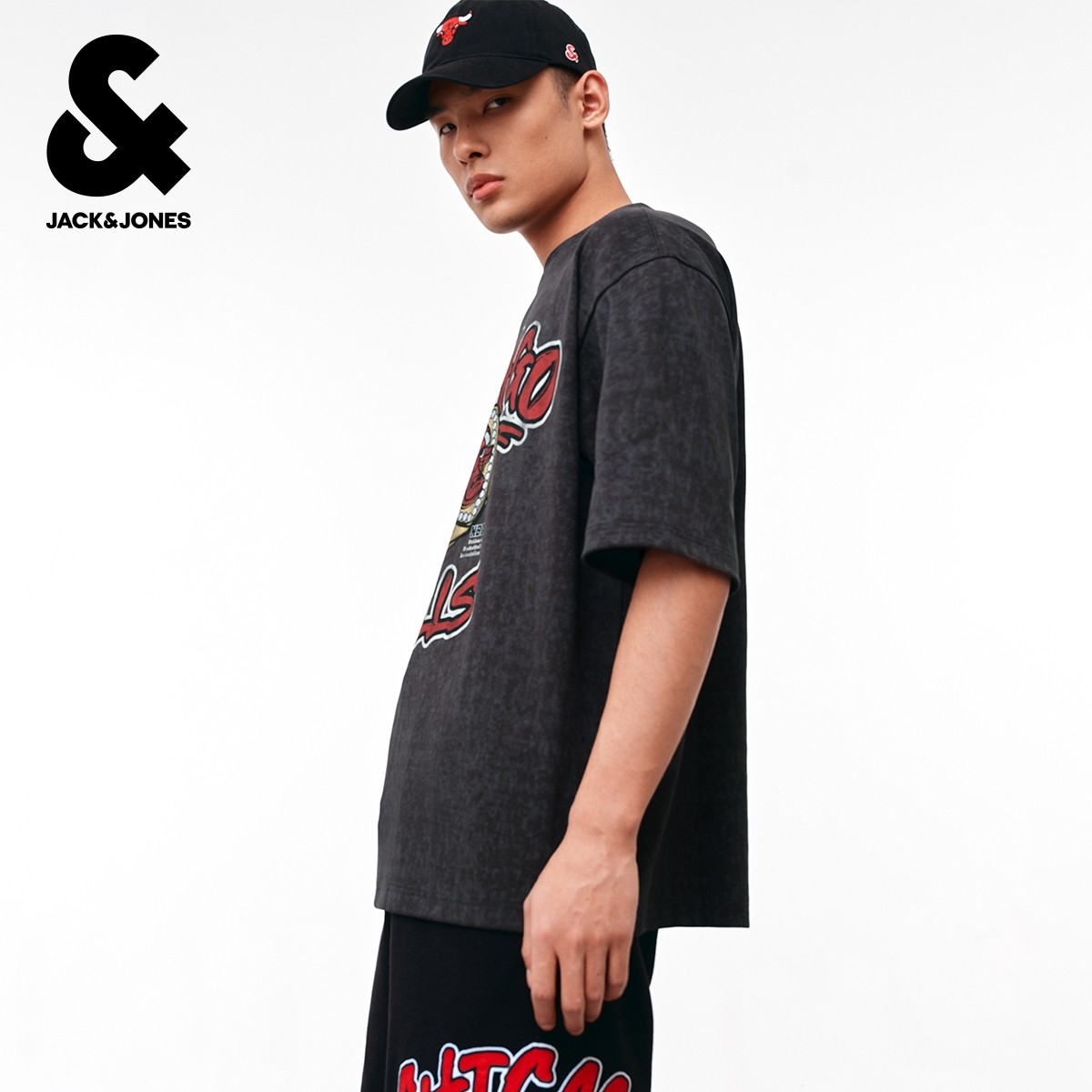 绫致杰克琼斯夏NBA联名公牛队舒适字母胶印圆领宽松T恤短袖男