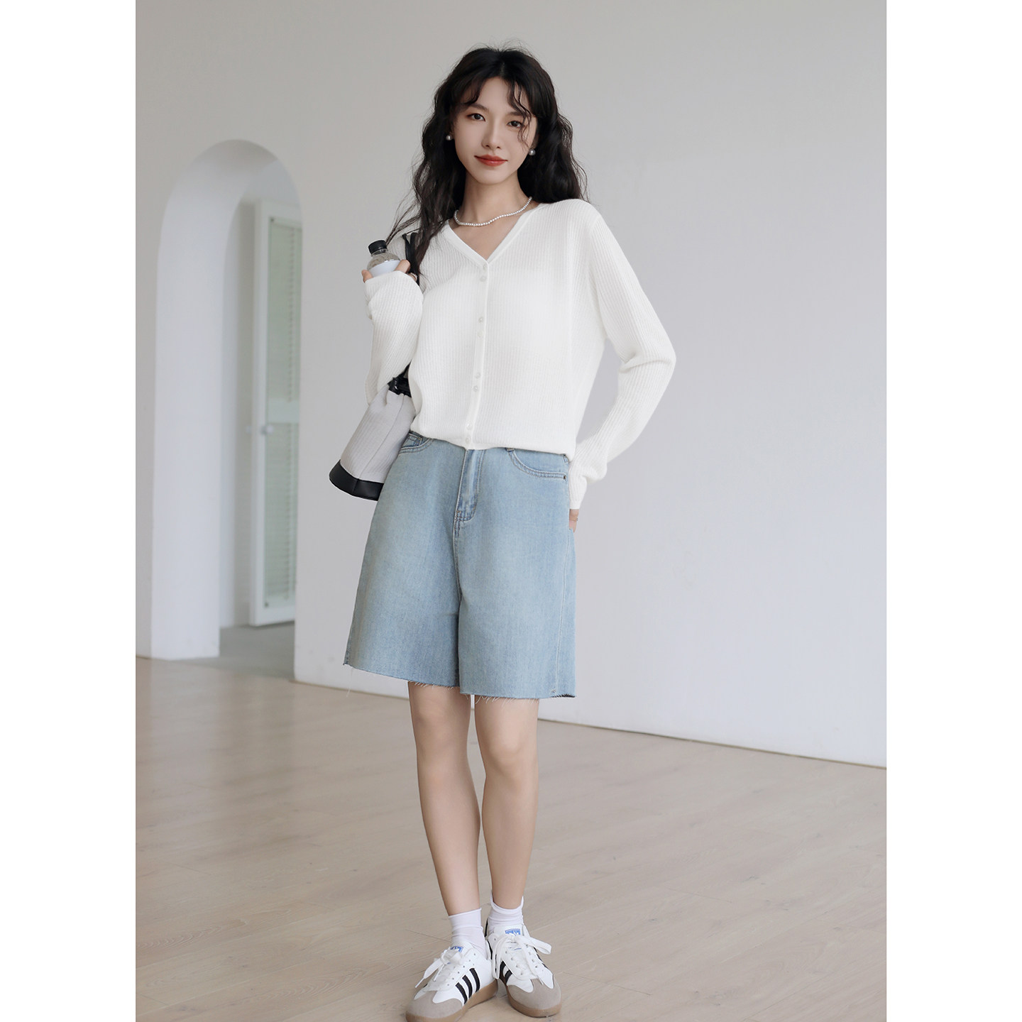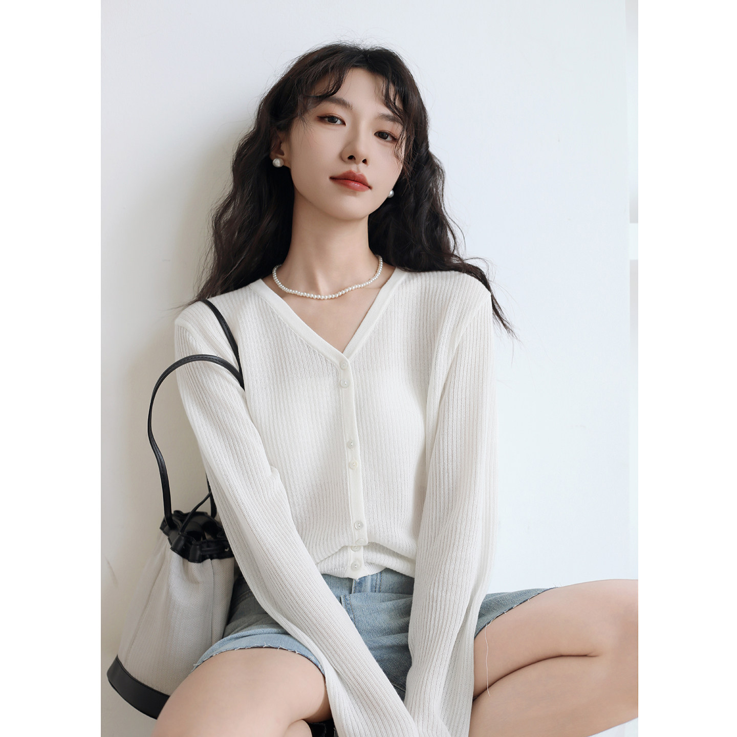 白色V领长袖针织开衫女
