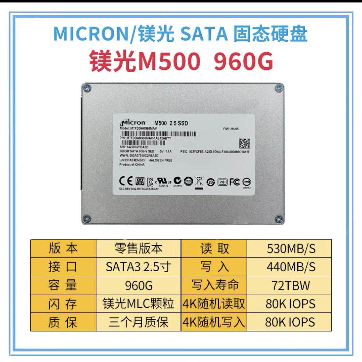 MICRON/镁光 M500 960G 2.5寸 SATA3.0接口 MLC 全新固态硬盘SSD