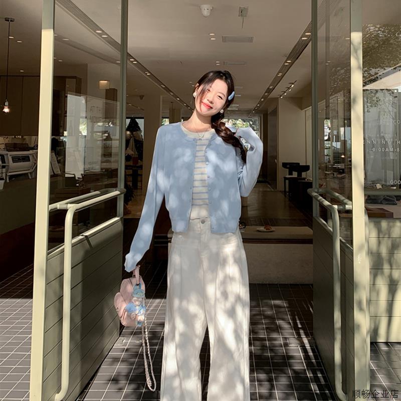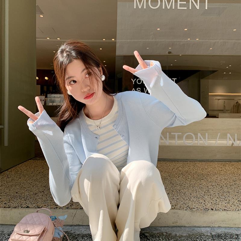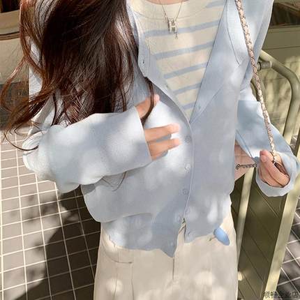 设计感韩系假两件条纹针织开衫女秋冬内搭小个子羊绒毛衣外套上衣