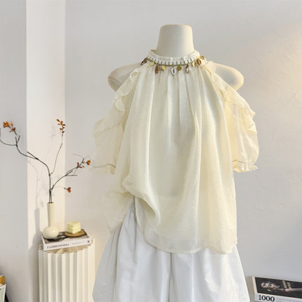 法式温柔风挂脖露肩短袖衬衫女2025夏季设计感荷叶边雪纺小衫上衣