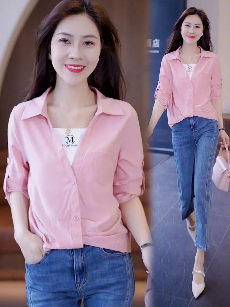 拼接假两件女士衬衫红色长袖衬衣女2024春夏季新款百搭显瘦上衣服
