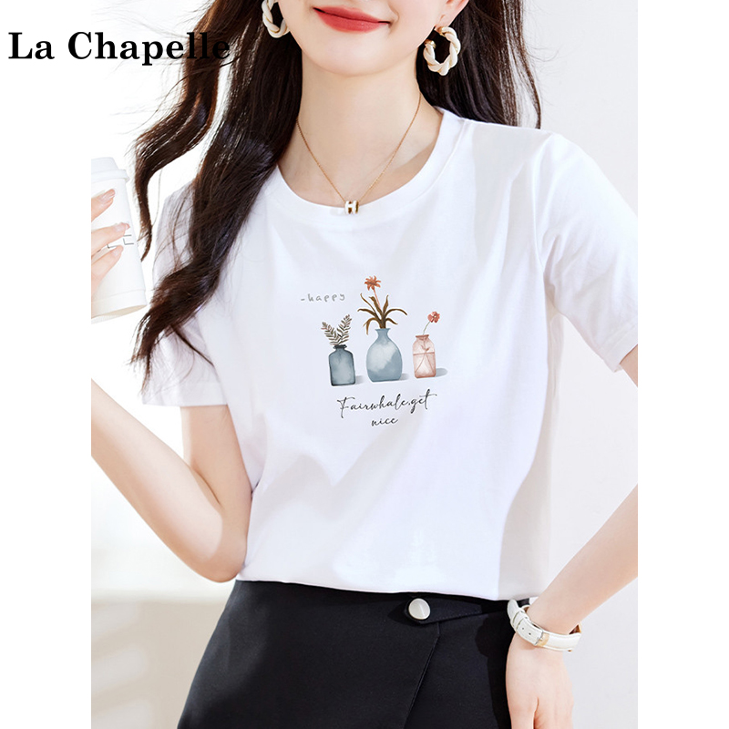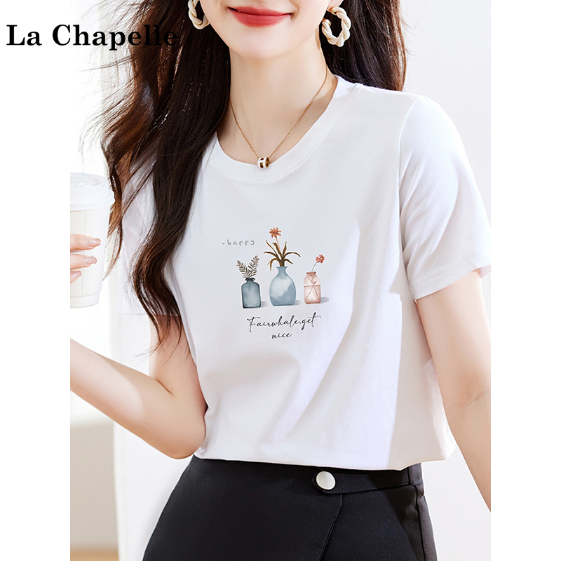 拉夏贝尔白色短袖t恤女2025新款夏季圆领纯棉半袖设计感正肩上衣