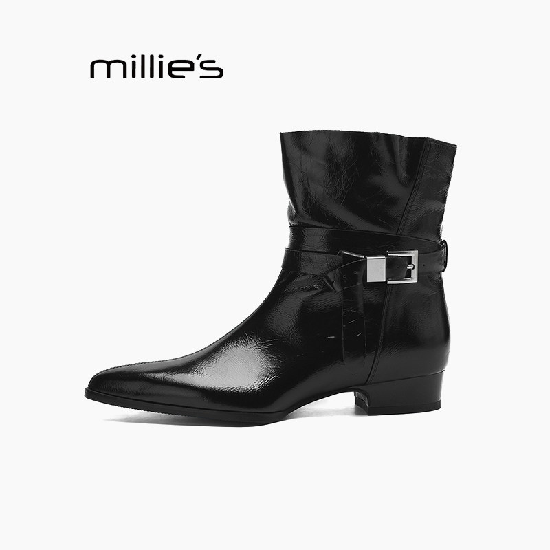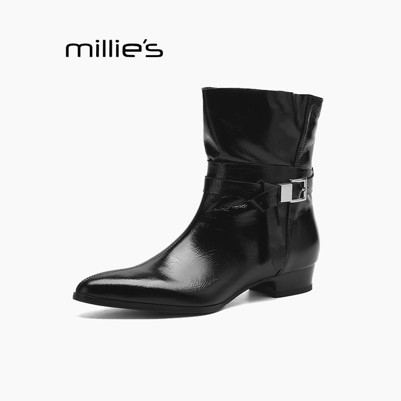 MILLIE'S/妙丽黑色皮带扣尖头切尔西靴女短靴显瘦气质机车靴减龄Z
