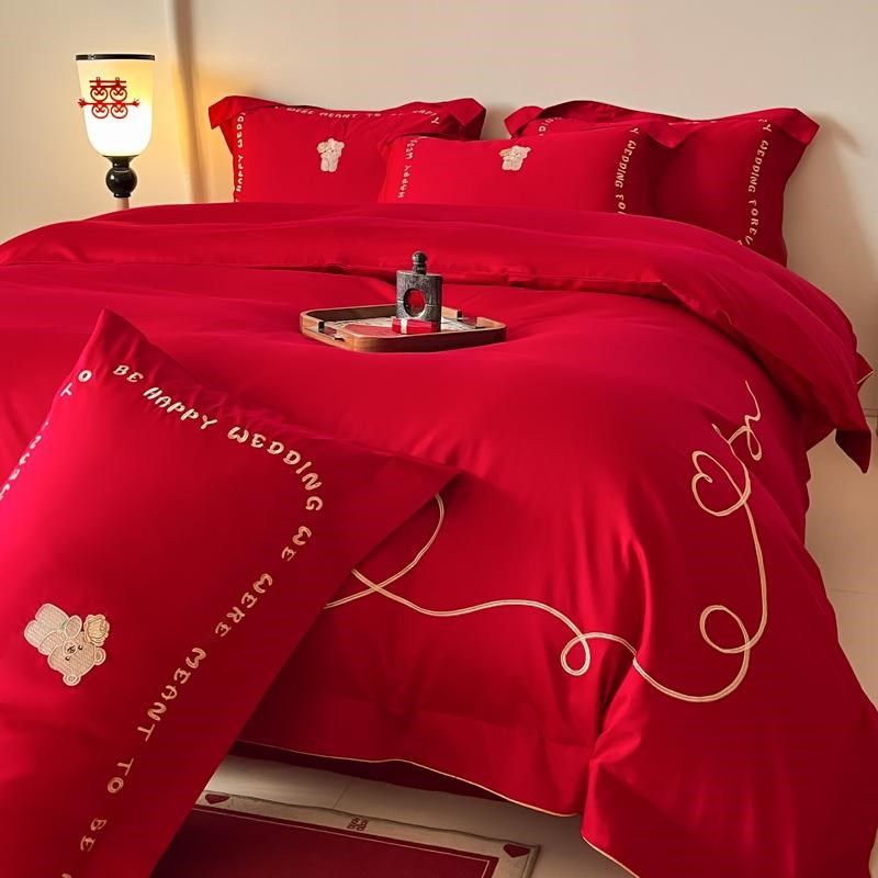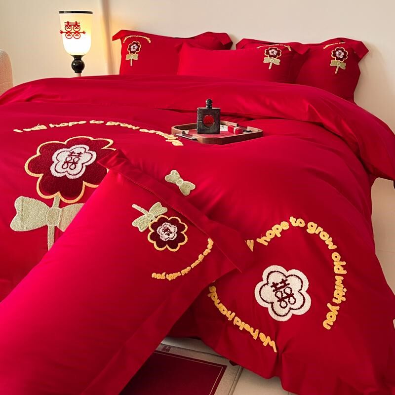 高级感全棉婚庆四件套喜字刺绣结婚红色婚房被套床单床上用品