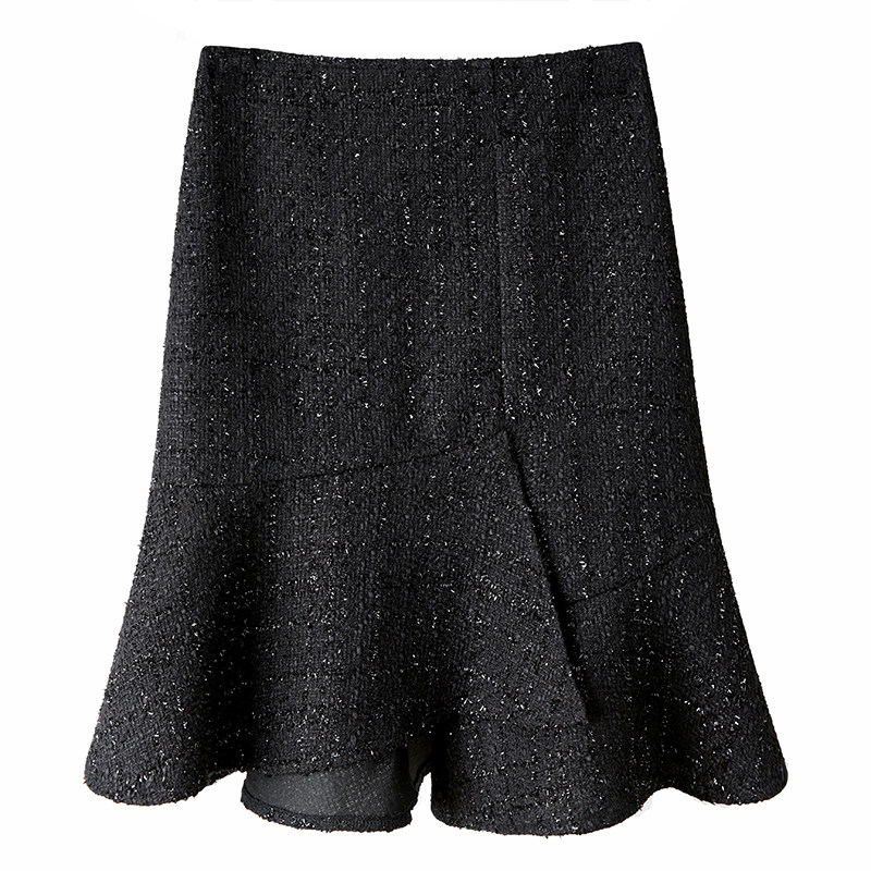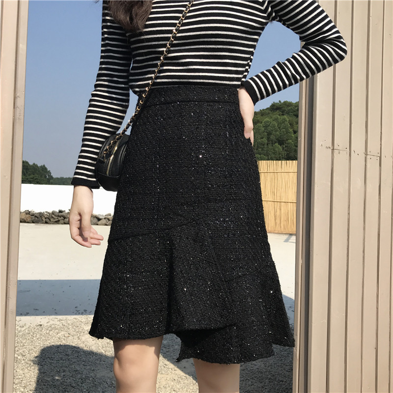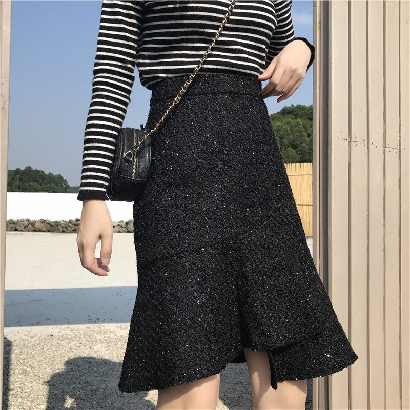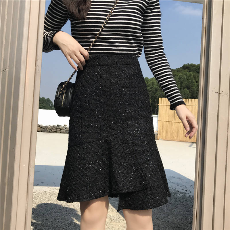 大码粗花呢鱼尾裙半身裙秋冬胖mm高腰a字包臀裙开叉不规则中长裙