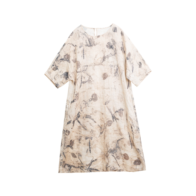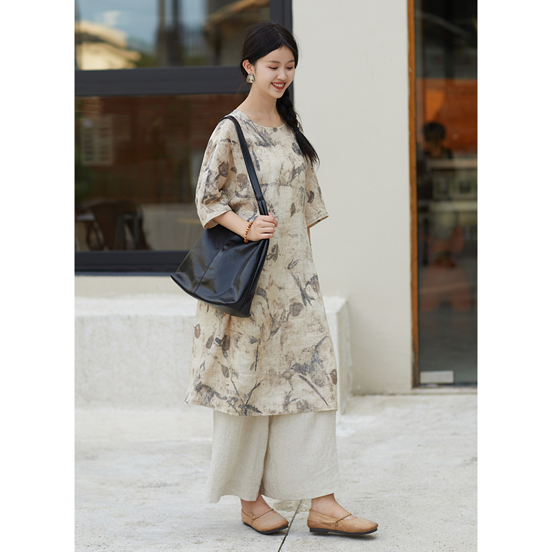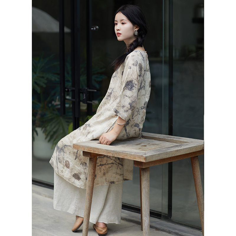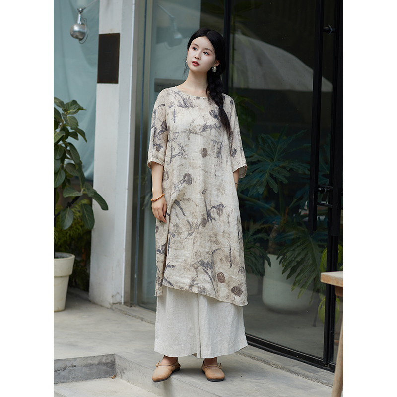 忘城T579座/树影为墨/早新款21支亚麻树影印花连衣裙中式禅意长裙