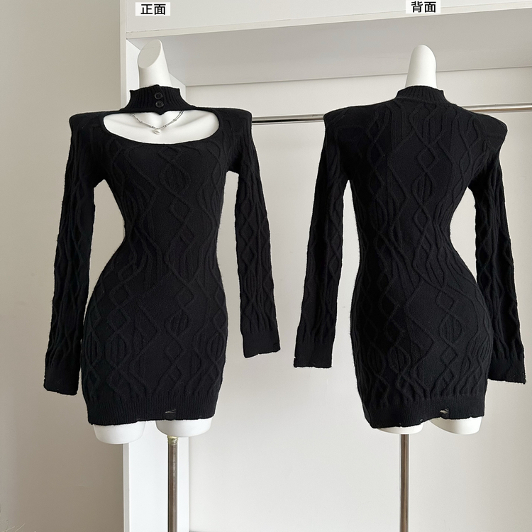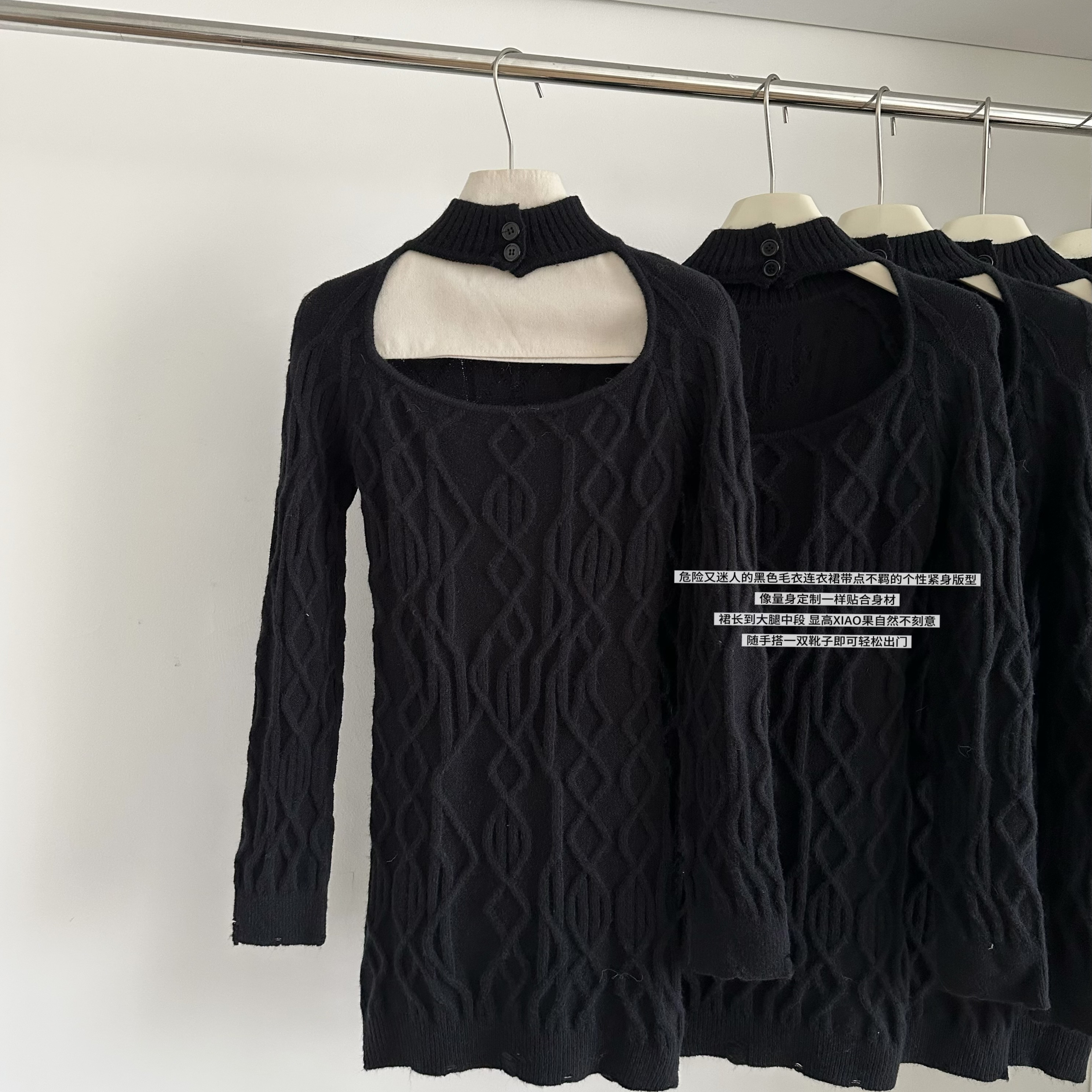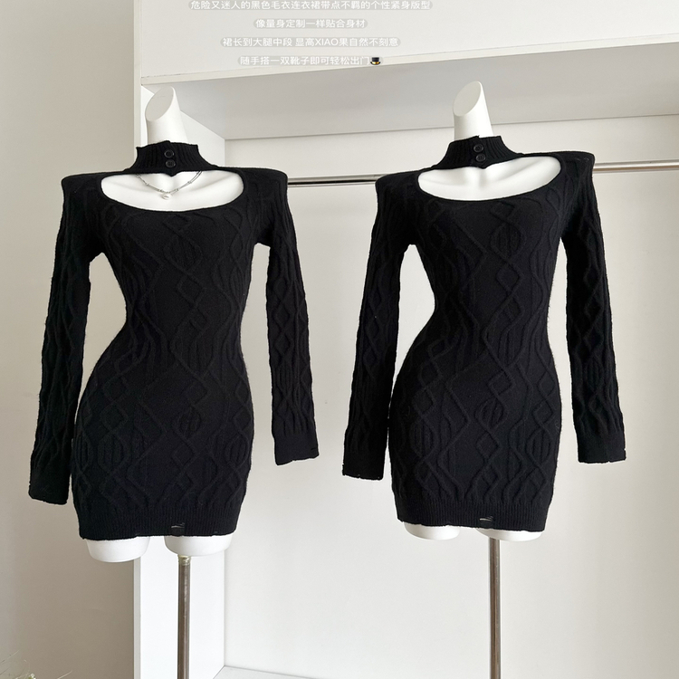 黑色镂空长袖毛衣连衣裙女装秋冬修身高弹力针织包臀短裙打底裙子