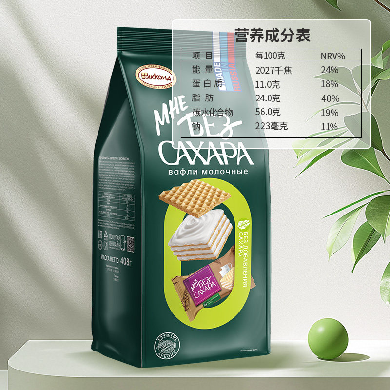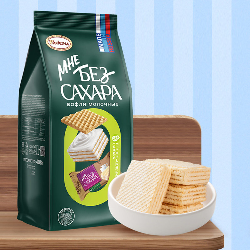 俄罗斯进口阿孔特无蔗糖牛奶味威化饼干408g儿童零食品轻负担