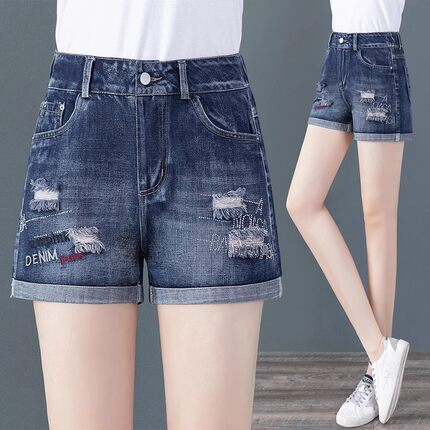 高腰牛仔短裤女夏2025新款宽松显瘦卷边阔腿A字裤时尚刺绣热裤