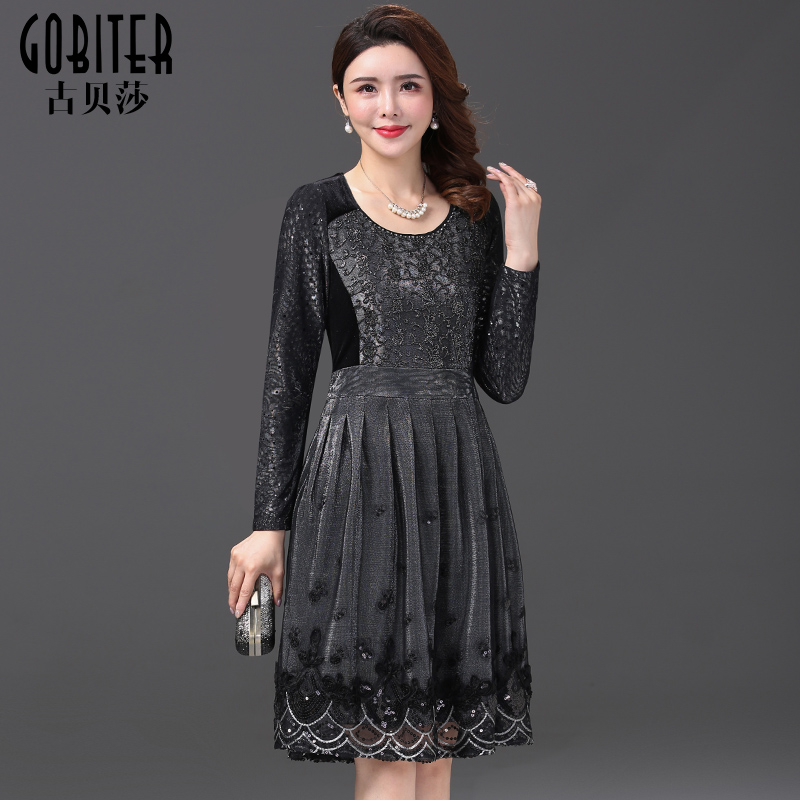 古贝莎女装品牌秋装网纱刺绣中年妈妈装名媛气质连衣裙