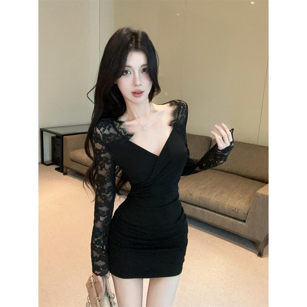 法式黑色收腰甜辣妹蕾丝v领长袖连衣裙女秋季设计感修身包臀短裙