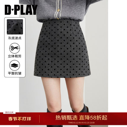 DPLAY【惠品】2025冬季新款灰色波点半身裙女短款仿毛呢裙子短裙