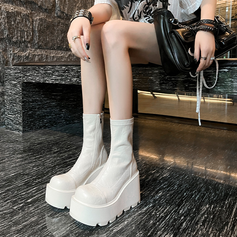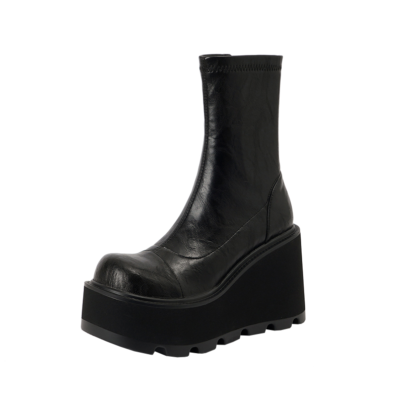 小个子厚底增高短靴子女秋冬新款坡跟真皮弹力瘦瘦靴超高跟马丁靴