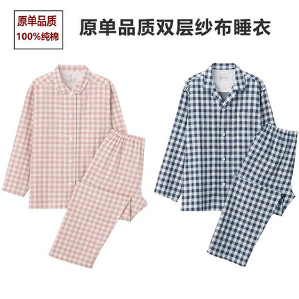 无印品质睡衣女双层纱布纯棉长袖春秋夏薄款男情侣格子良品家居服
