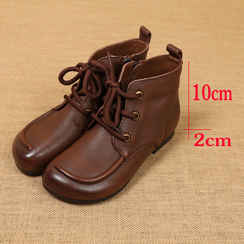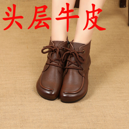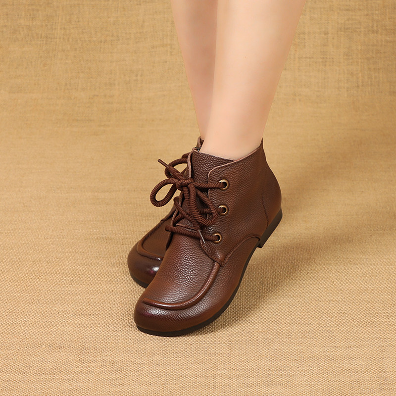 头层牛皮复古系带平底女靴民族风牛筋软底真皮短靴春秋季妈妈单靴