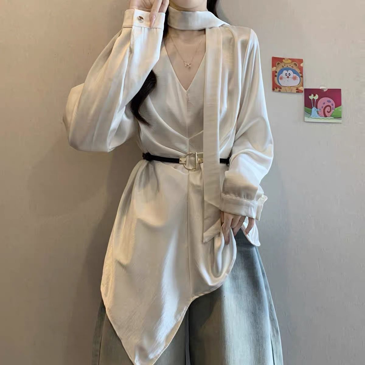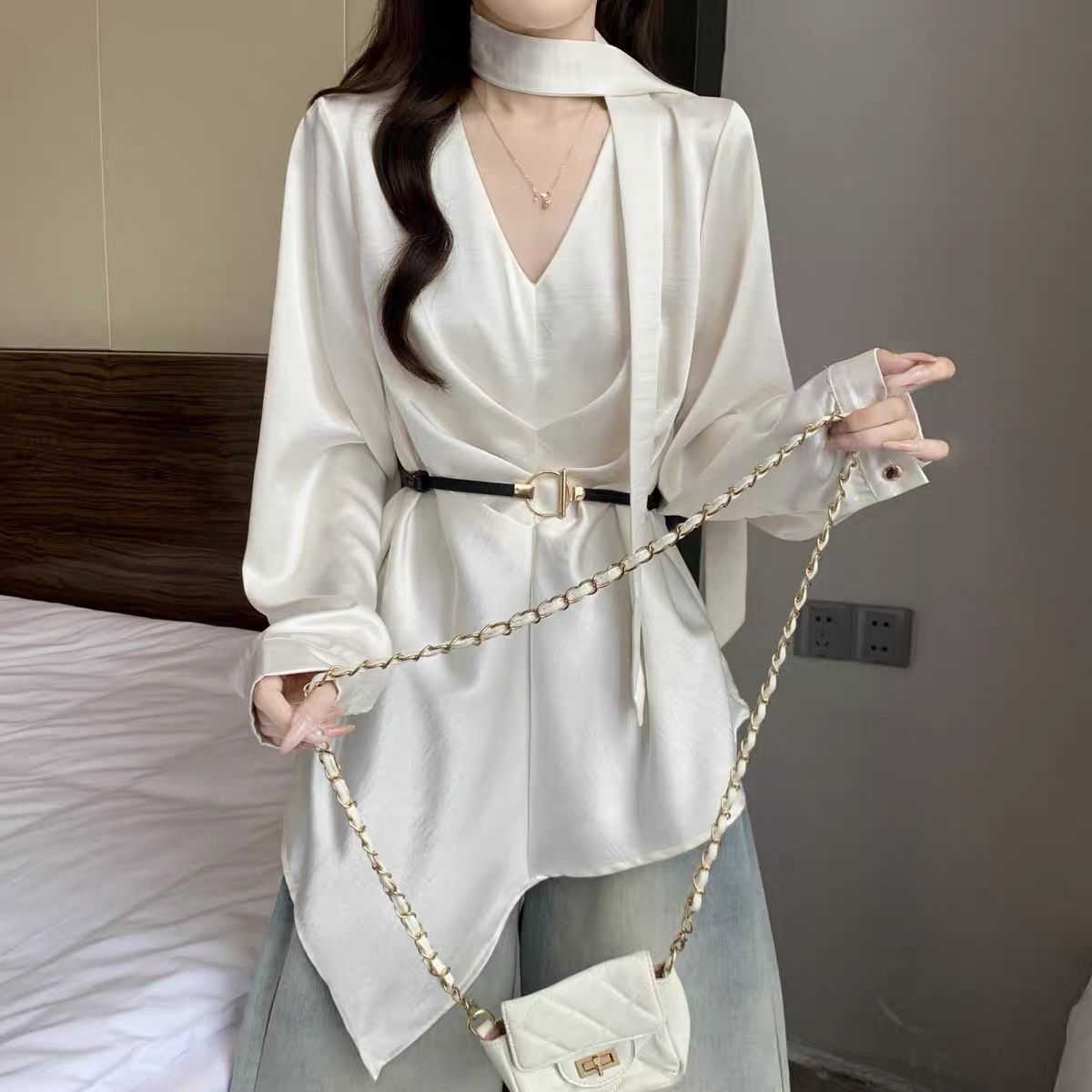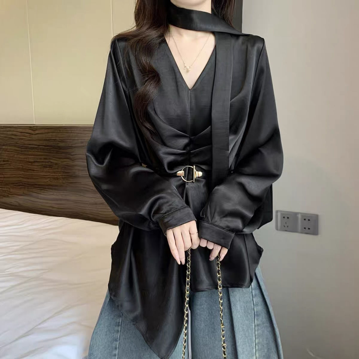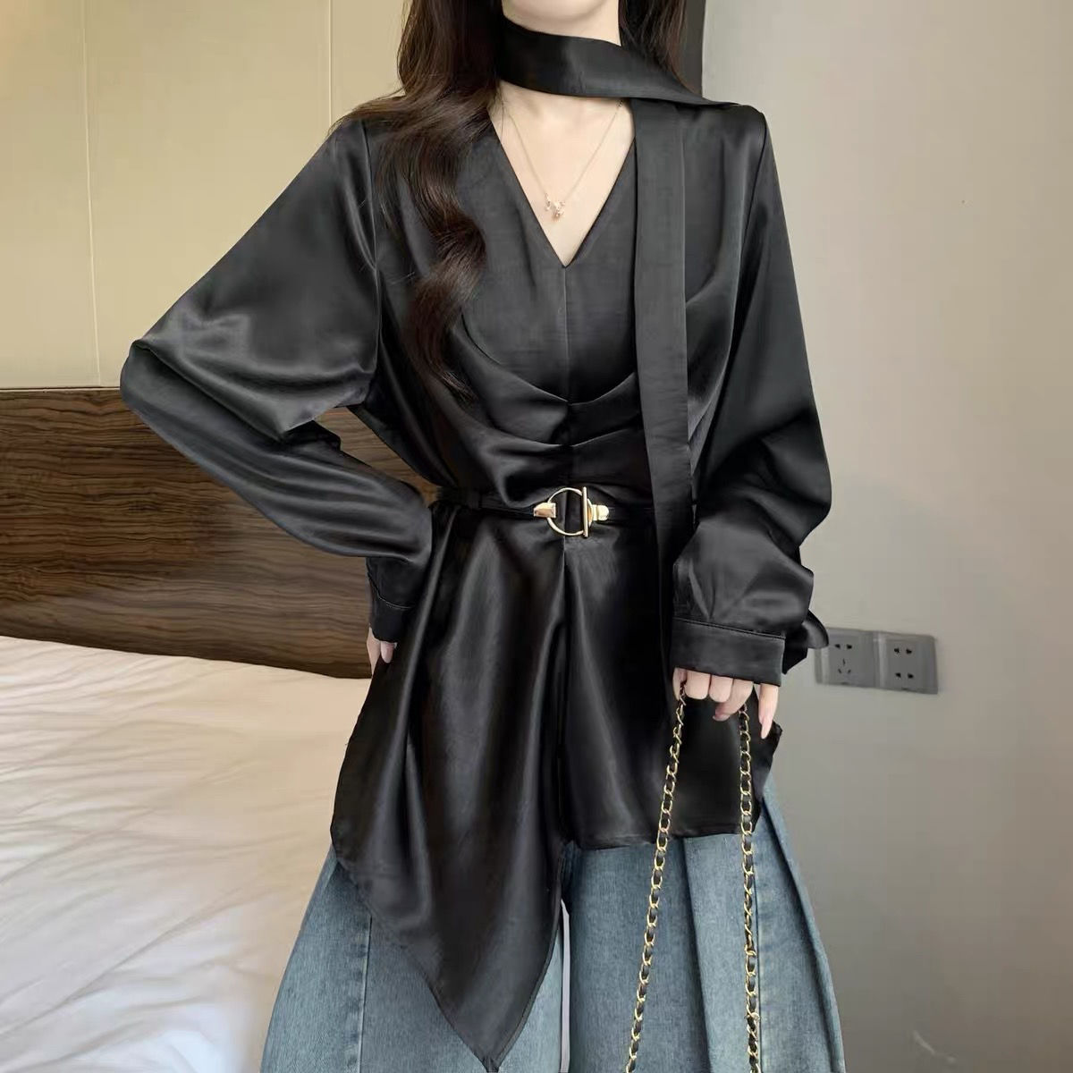 秋季气质名媛高级法式缎面亮丝不对称大码长袖V领衬衫女显瘦上衣