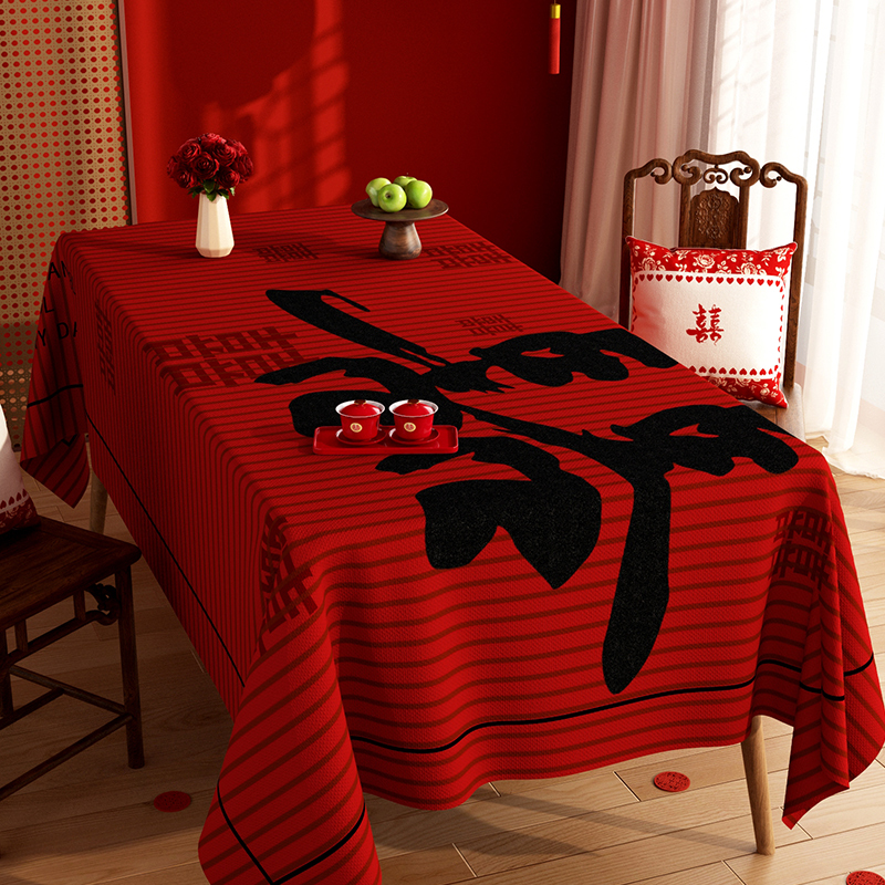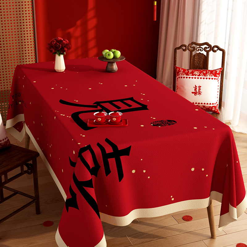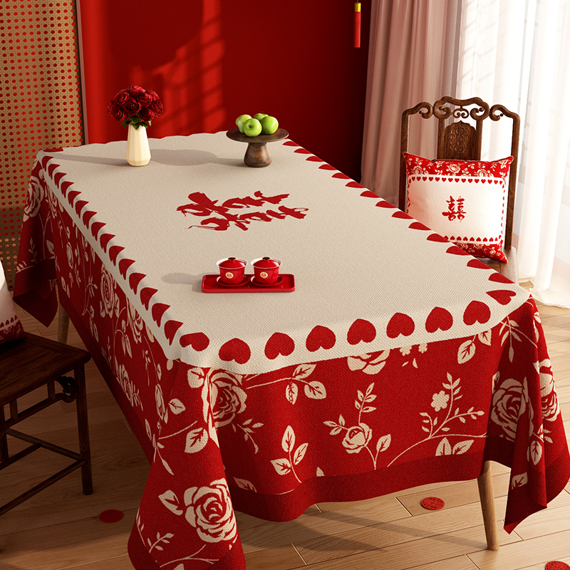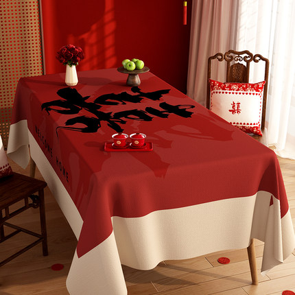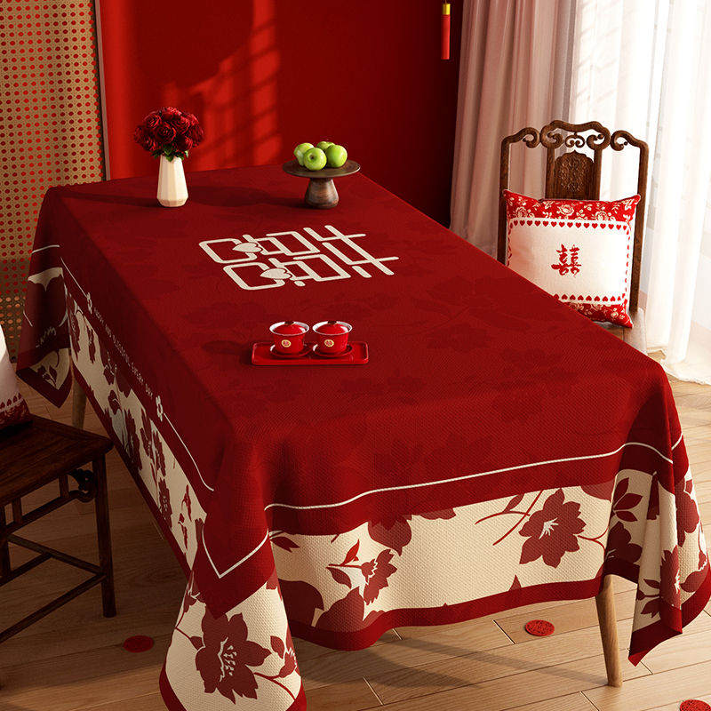 喜庆结婚布艺桌布长方形圆桌桌垫红色新婚喜字餐桌垫氛围感茶几布