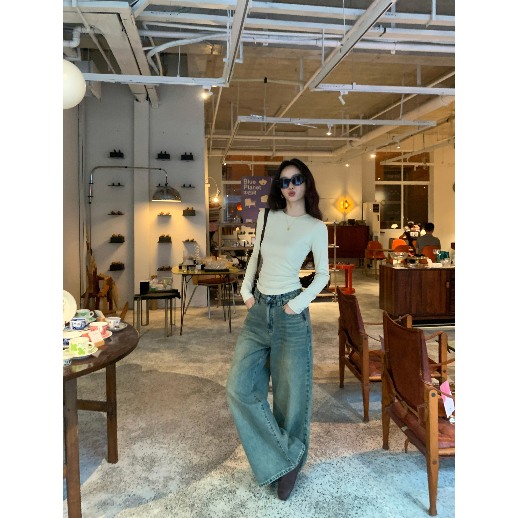 pusumede 淡颜加分项 圆领针织长袖T恤女收褶内搭修身打底衫上衣