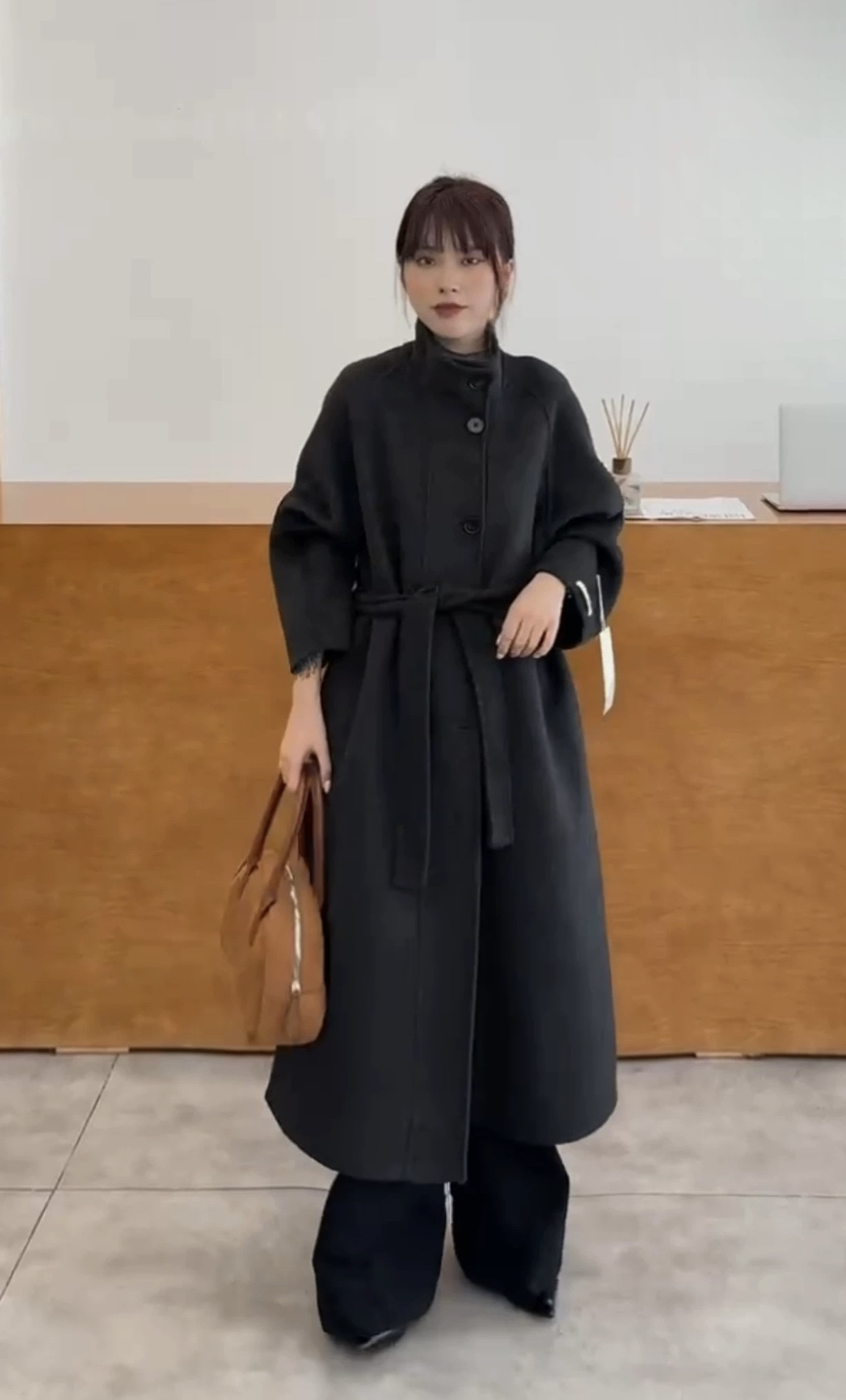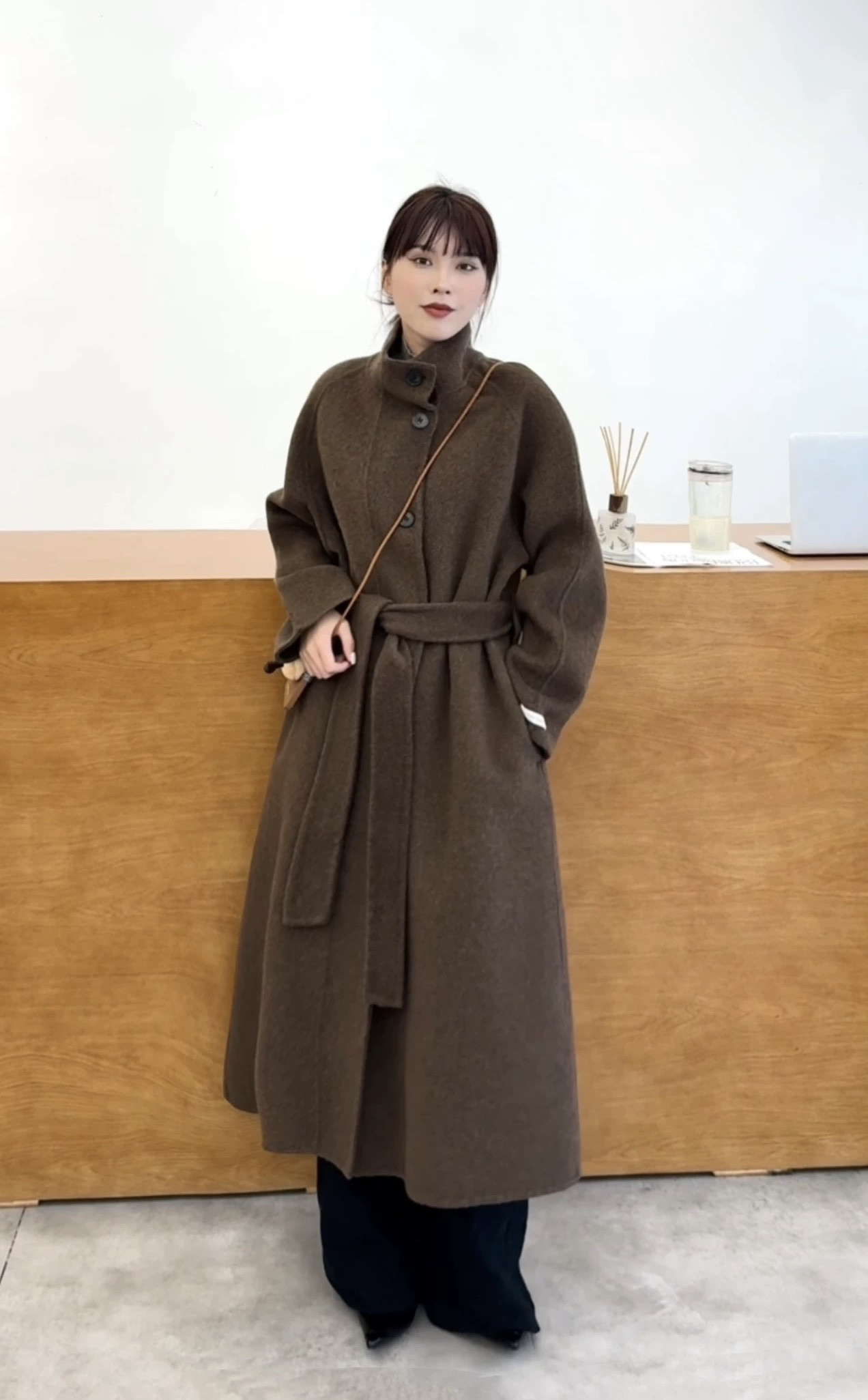 2025年冬季加厚立领双面羊毛大衣女长款韩版A型系带裙摆羊毛外套