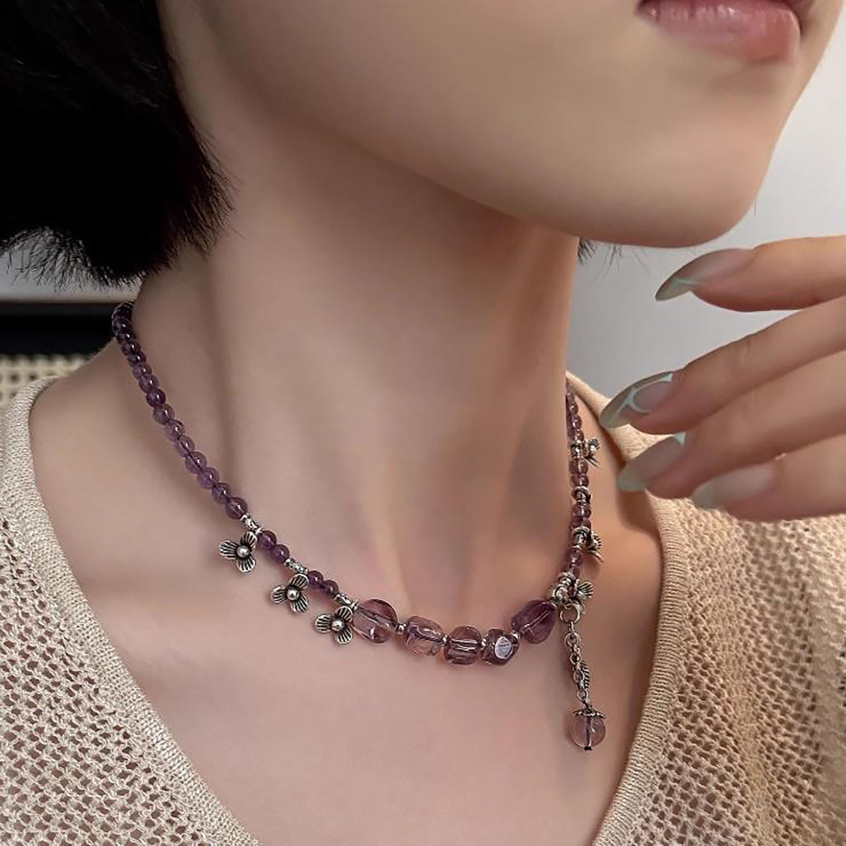 925银项链女紫水晶复古风新中式三叶花锁骨链轻奢小众设计高级感