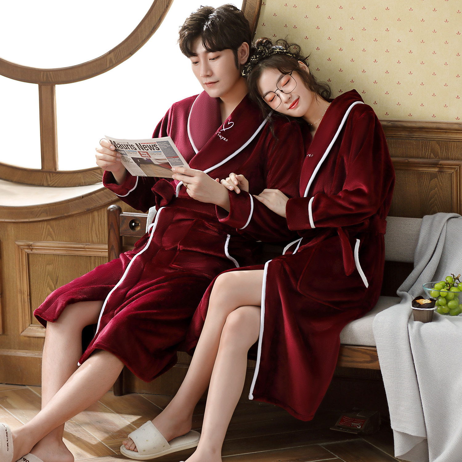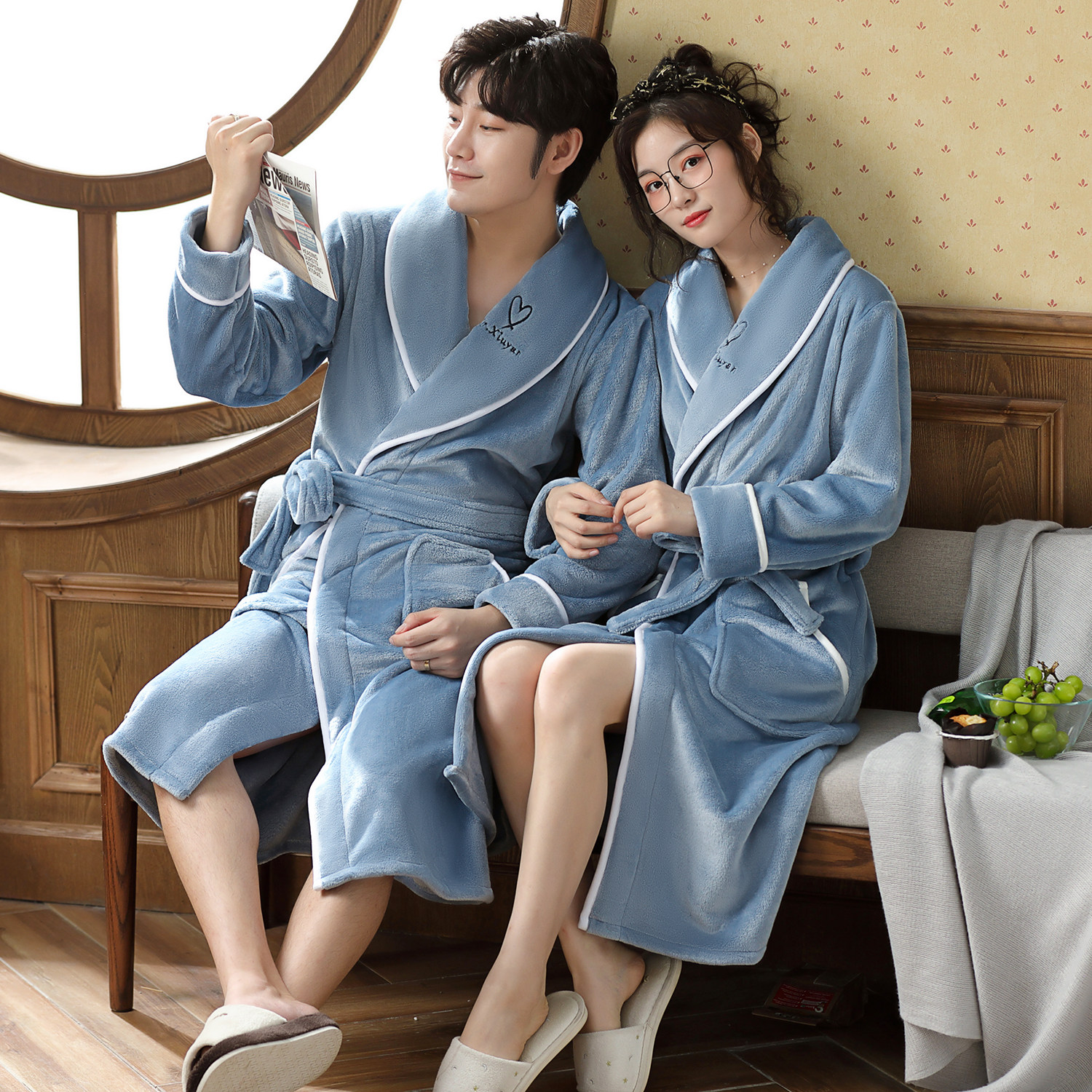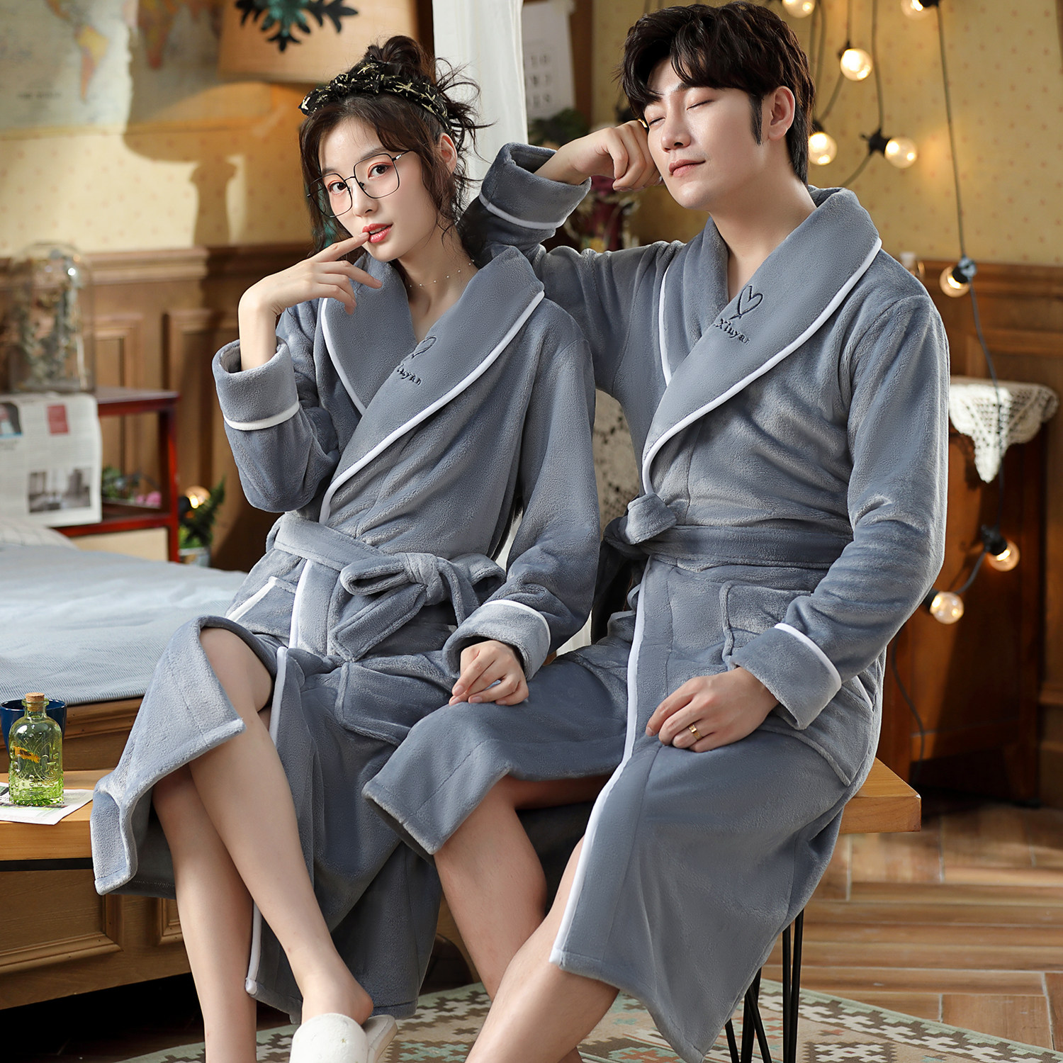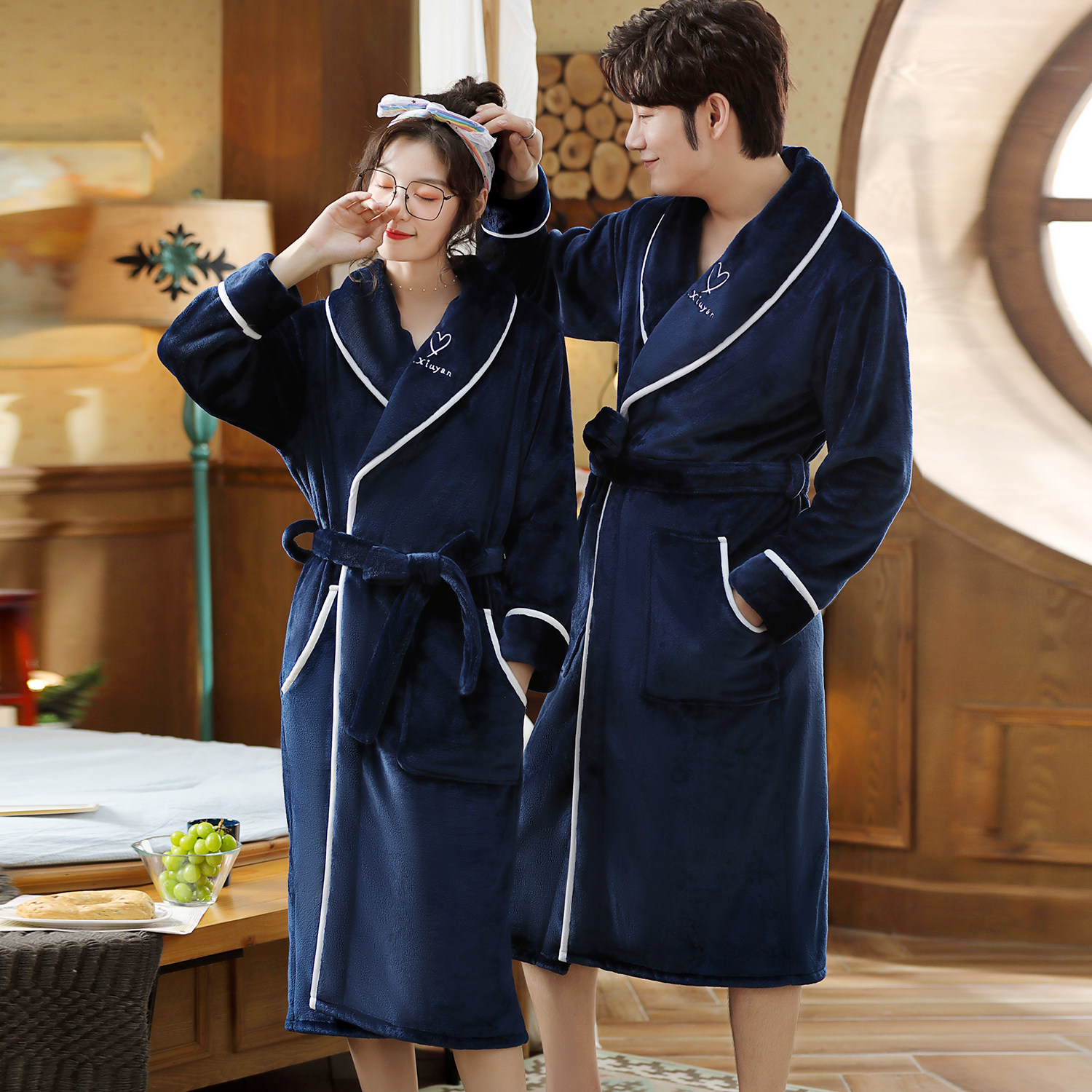 秋冬季法兰绒情侣睡袍男士长款睡衣珊瑚绒浴袍女加绒加厚大码晨袍