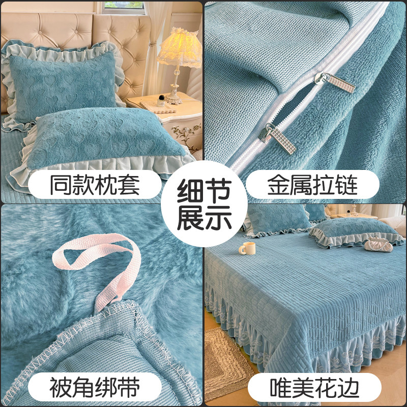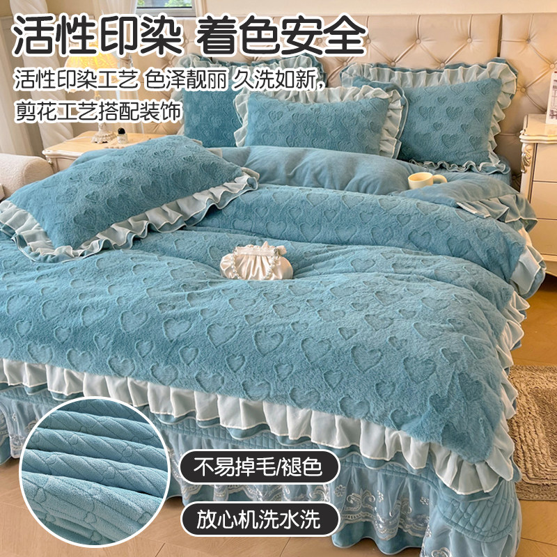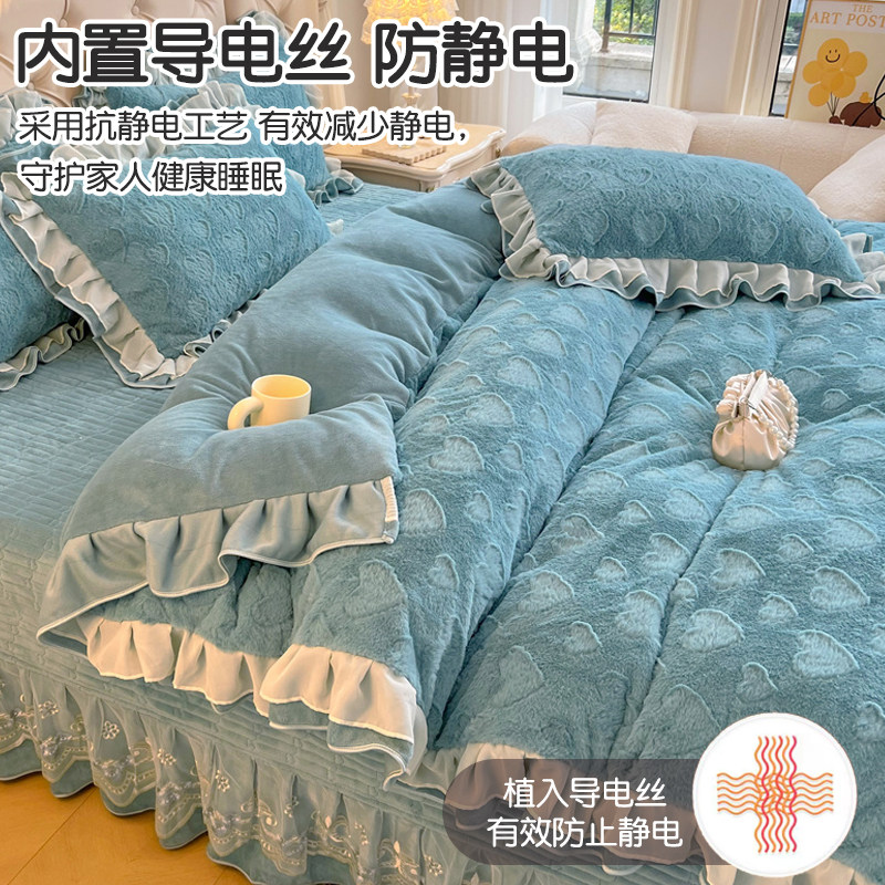公主风牛奶绒四件套2025新款冬季加厚珊瑚绒花边被套夹棉床盖床裙