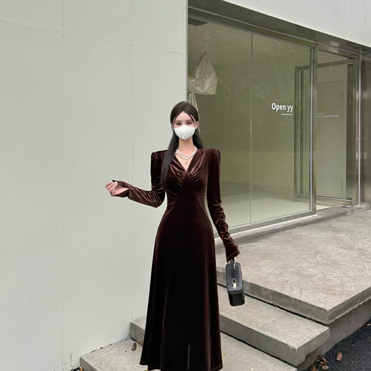 实拍~复古v领垂坠感丝绒连衣裙女秋冬季高级名媛气质礼服裙子