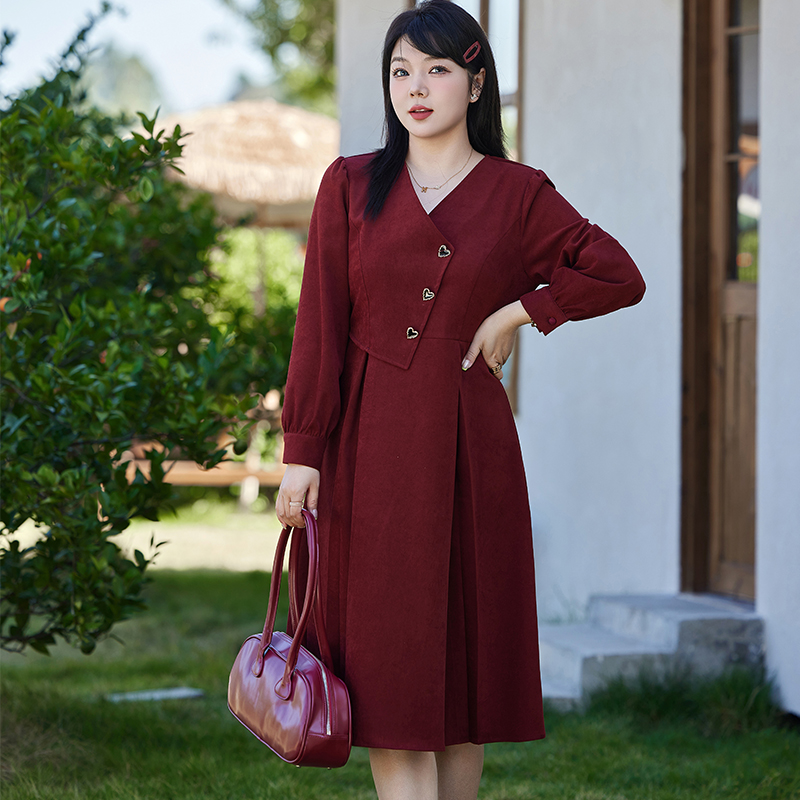 2024年冬装新款V领显瘦大码胖妹妹连衣裙收腰a版高级感磨毛红色裙