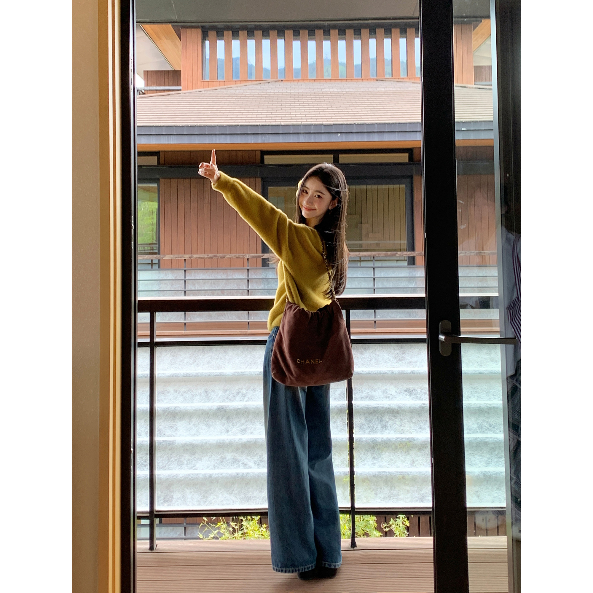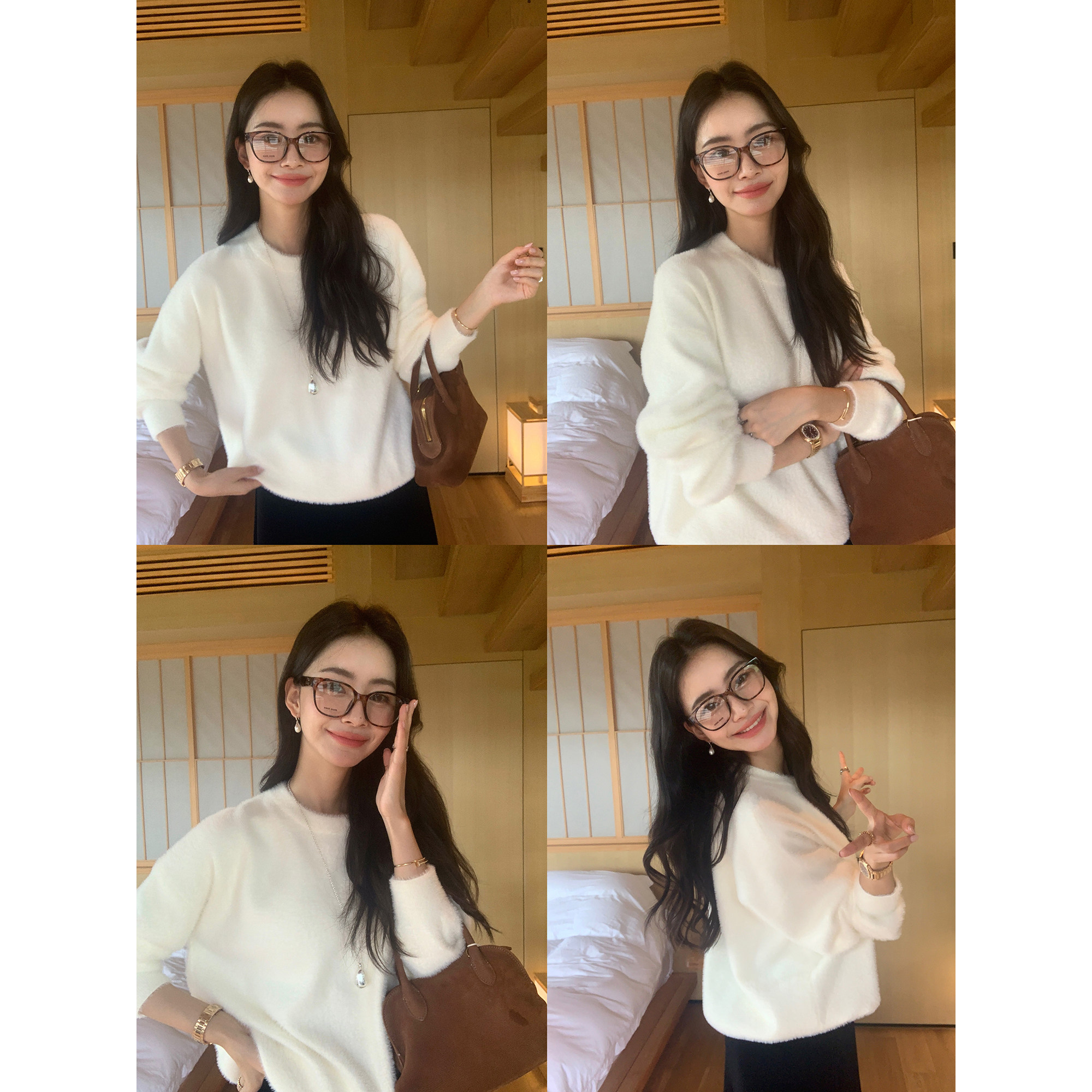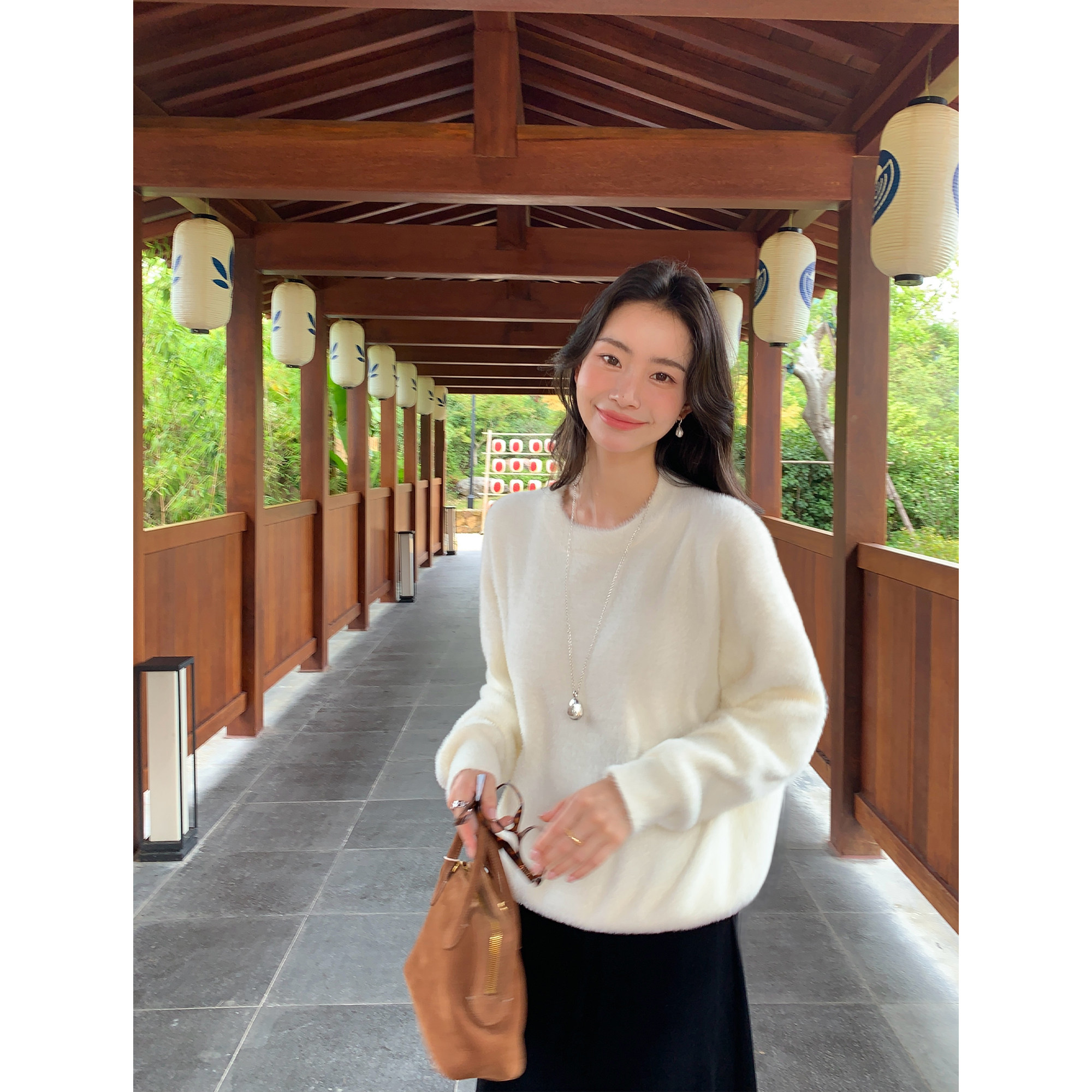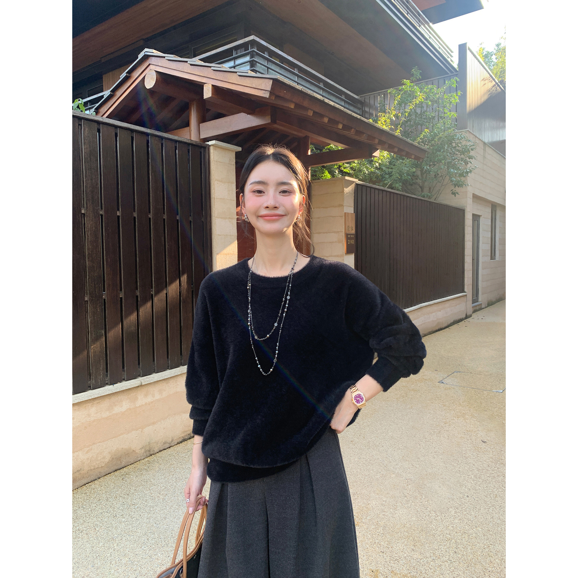 pusumede 温柔名单 软糯仿貂毛套头毛衣女气质圆领长袖针织上衣