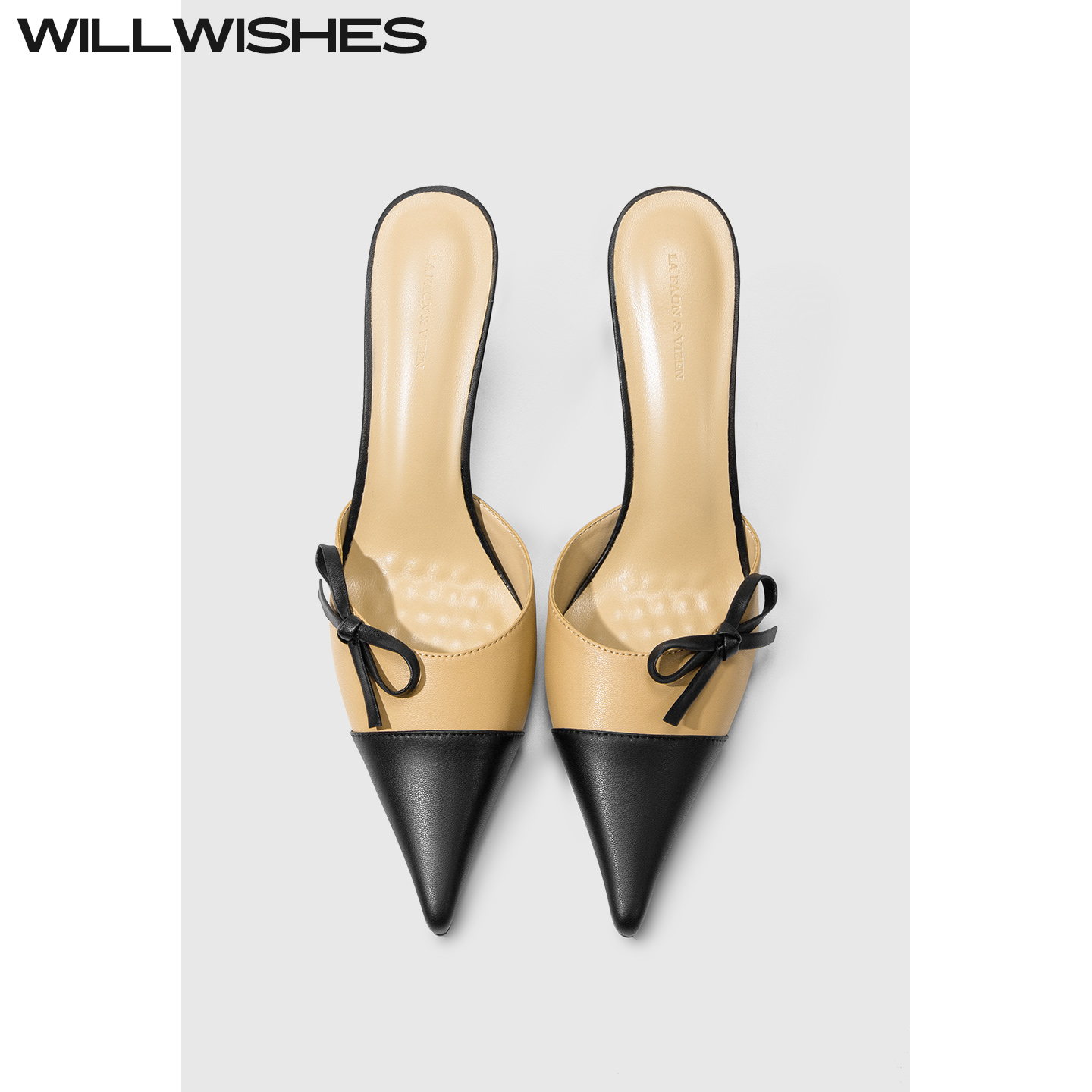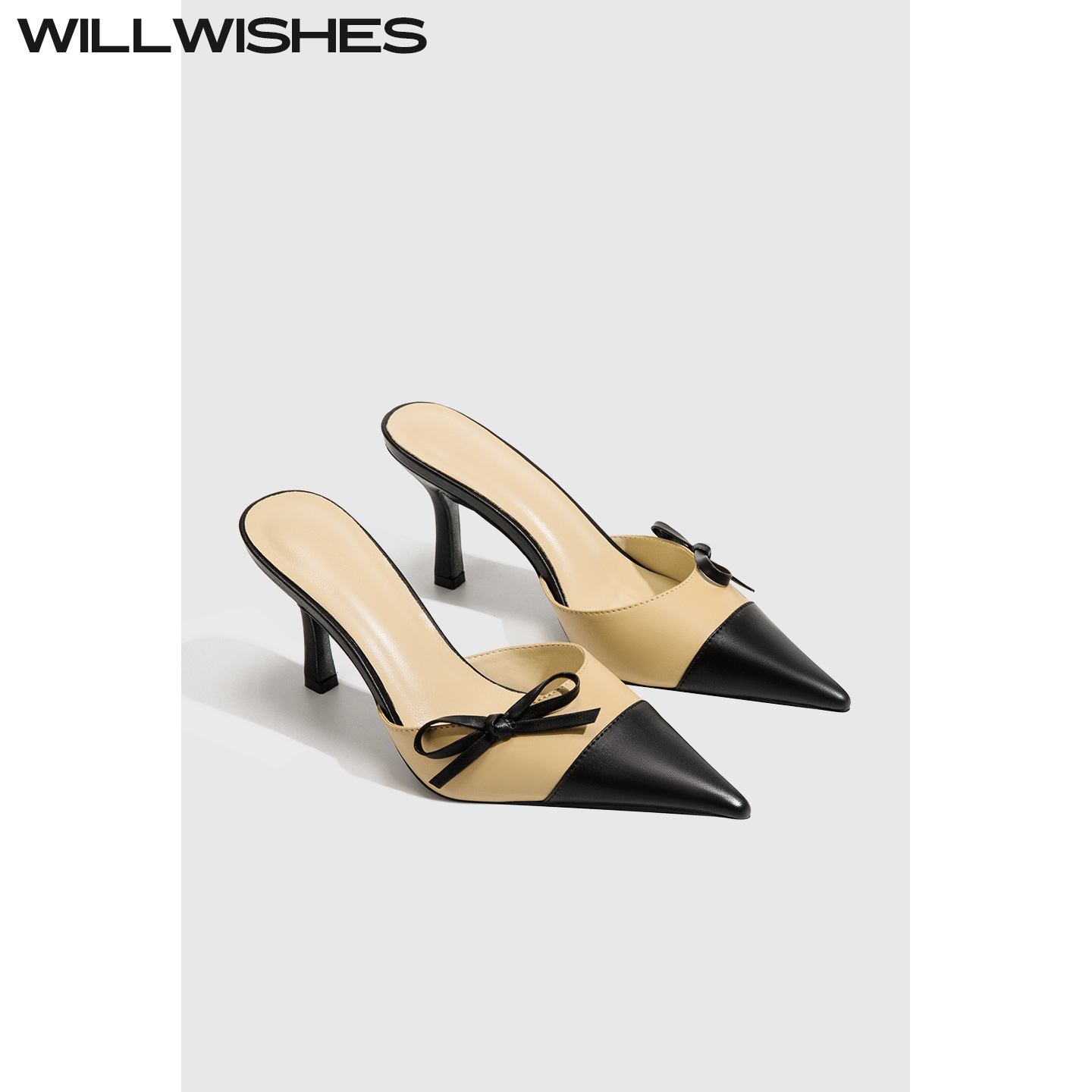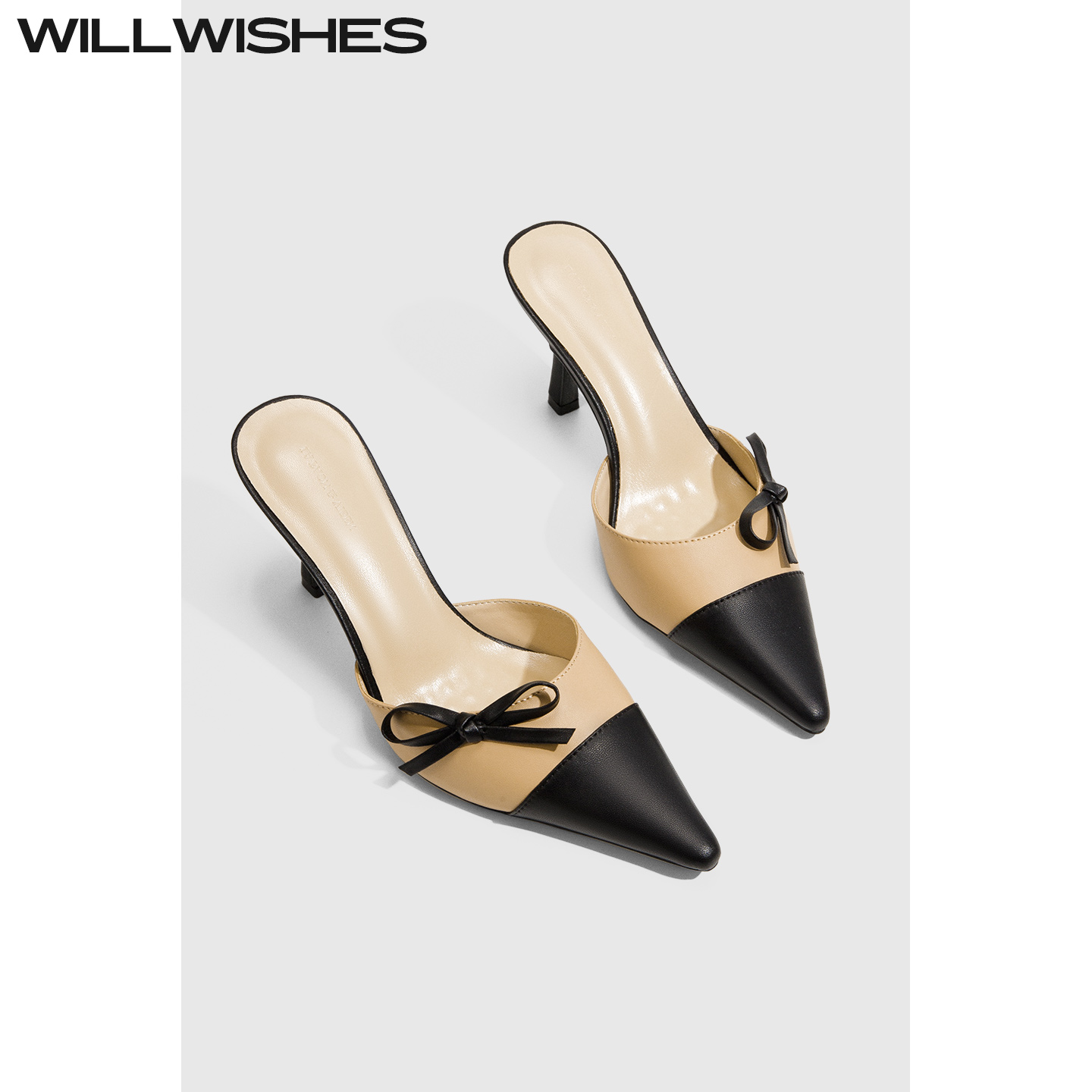 WILLWISHES 王玎设计细跟高跟鞋女气质半拖鞋蝴蝶结凉鞋女#5006-1