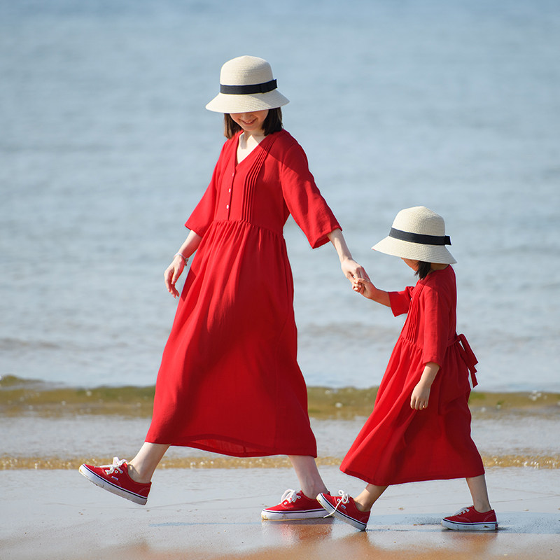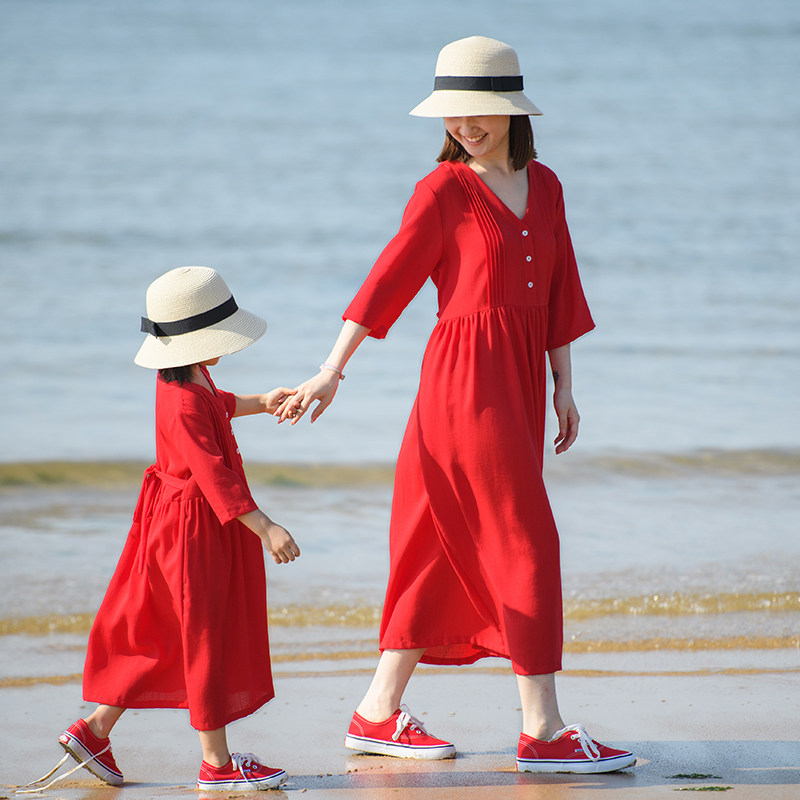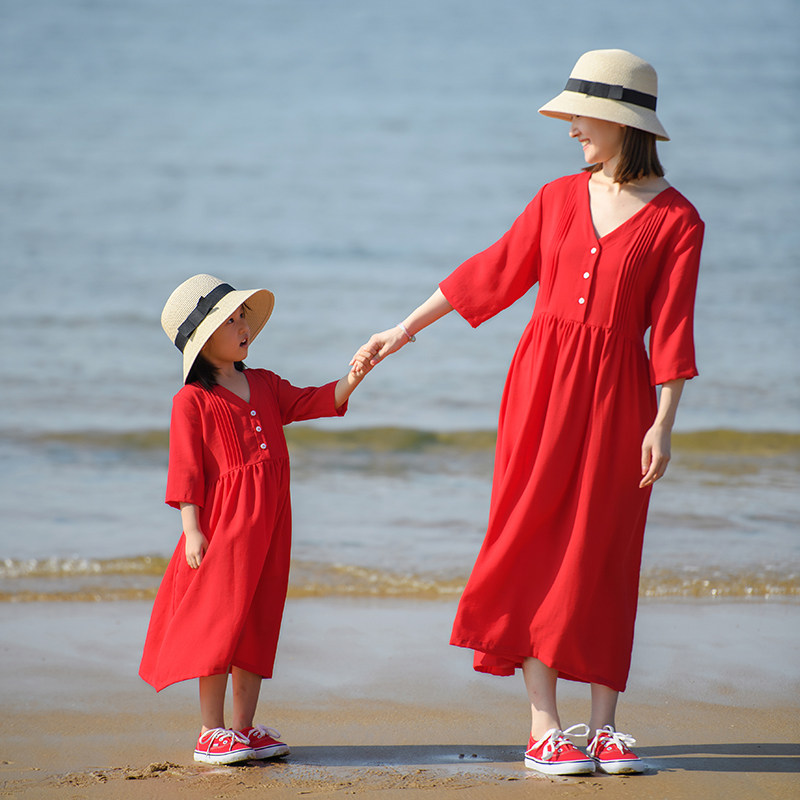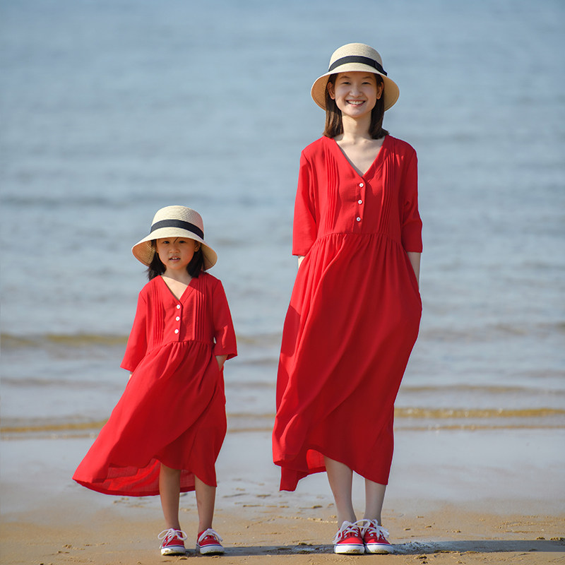 小乐往原创亲子装151课春夏V领大红色七分袖度假写真连衣裙母女装