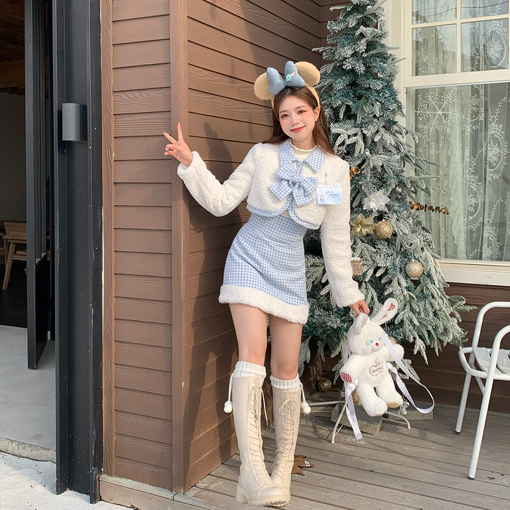 织物猪 奶油蓓蕾 富家千金风套装女秋冬蝴蝶结蓝白格纹短裙两件套