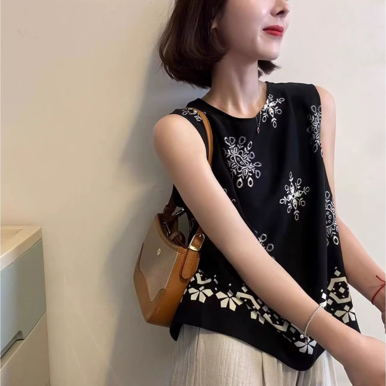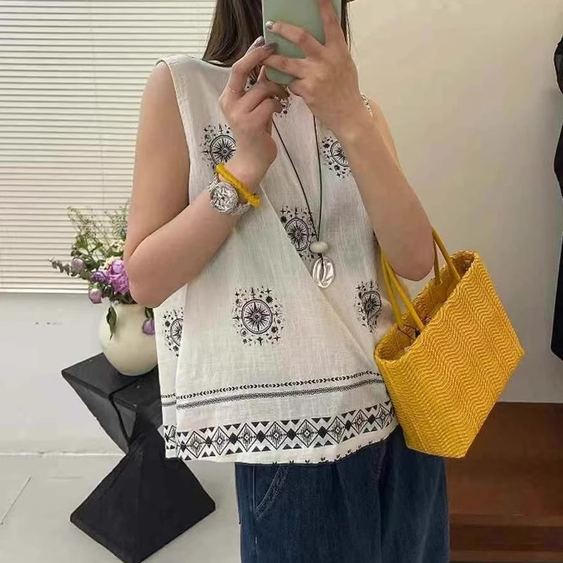 亚麻刺绣复古印花吊带背心女内搭