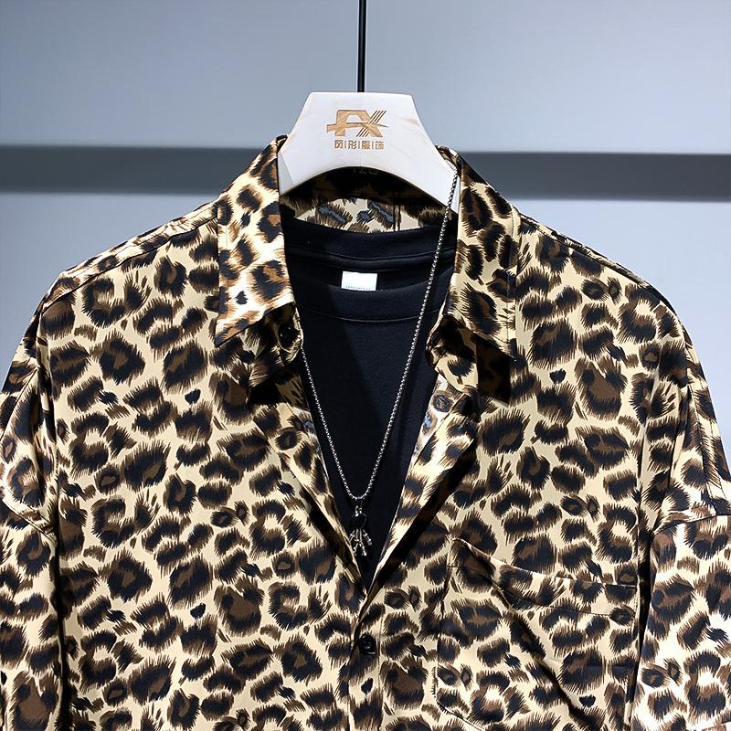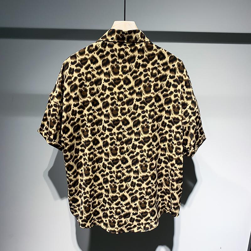 300斤大码男装港风豹纹短袖衬衫男夏季薄款美式复古情侣外套衬衣2