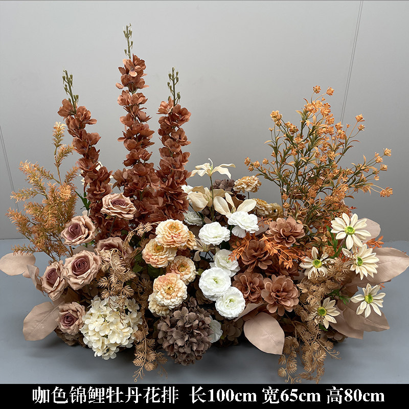 婚庆地排花咖色花艺订婚宴布置婚礼堂舞台路引花婚庆绢花排仿真花
