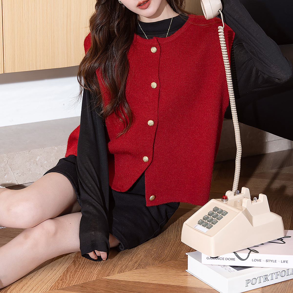唐狮2025秋冬季女毛衣简约风百搭圆领开衫马甲红色系氛围感