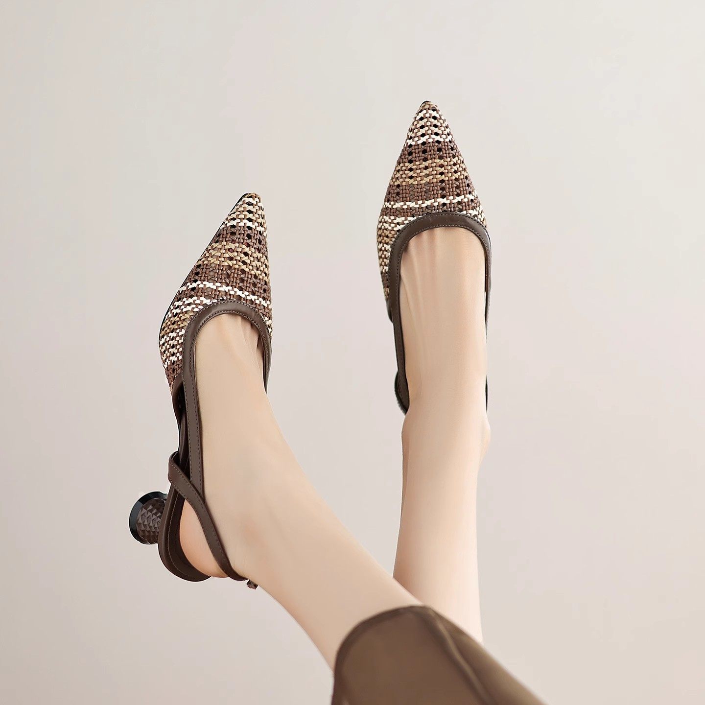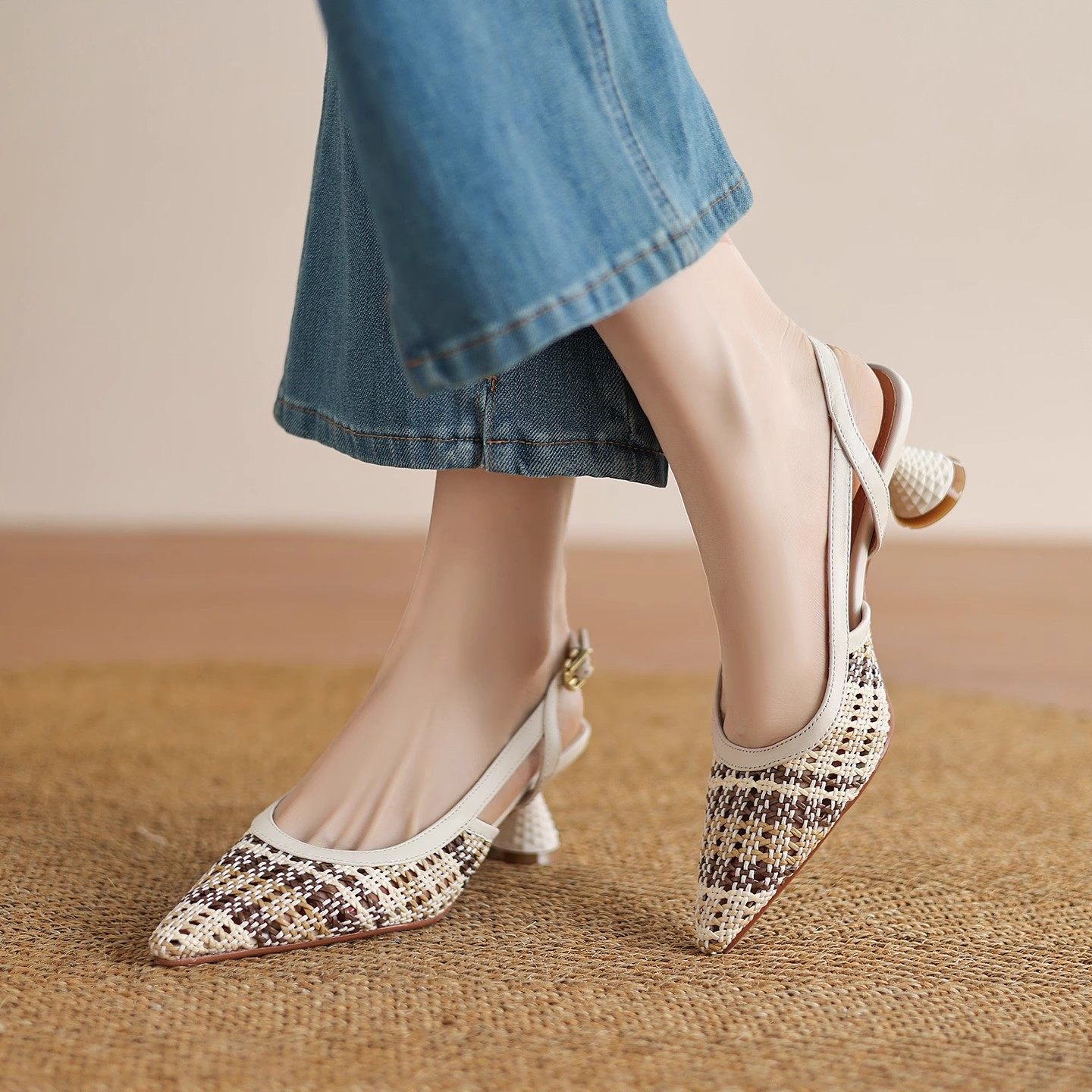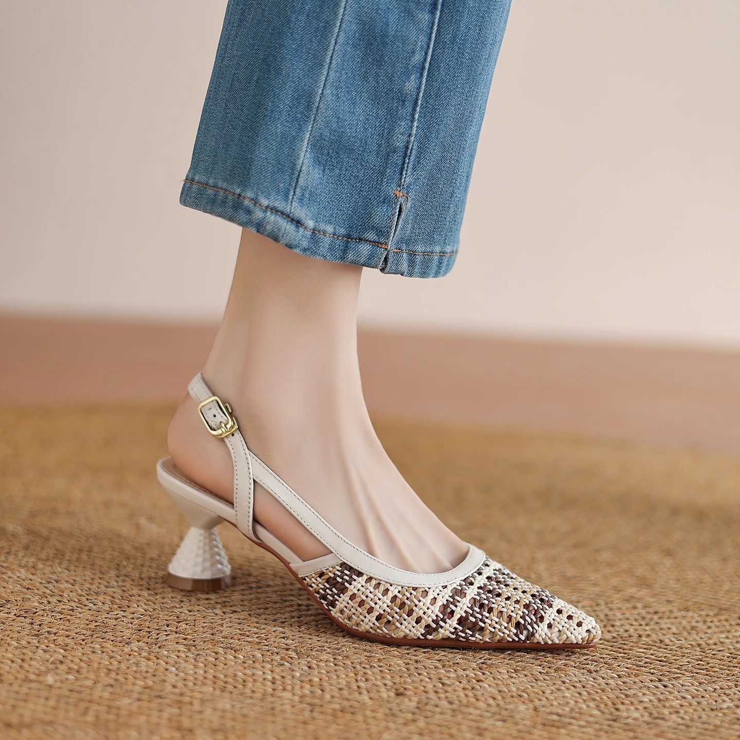 5.5cm法式编织镂空尖头包头凉鞋女2025年夏新款后空跟鞋细跟百搭