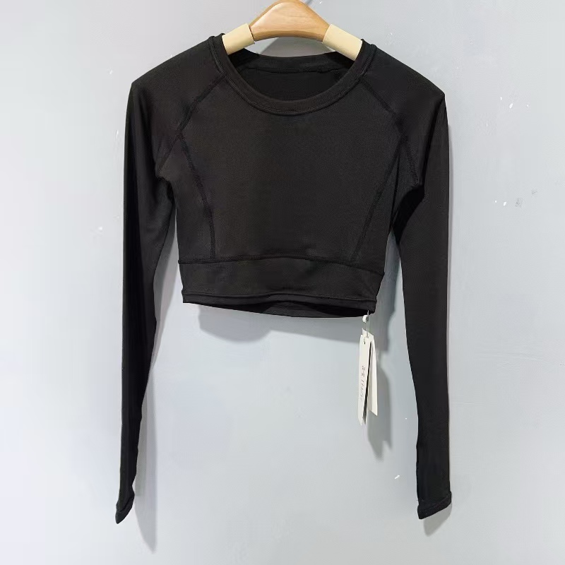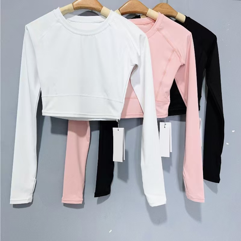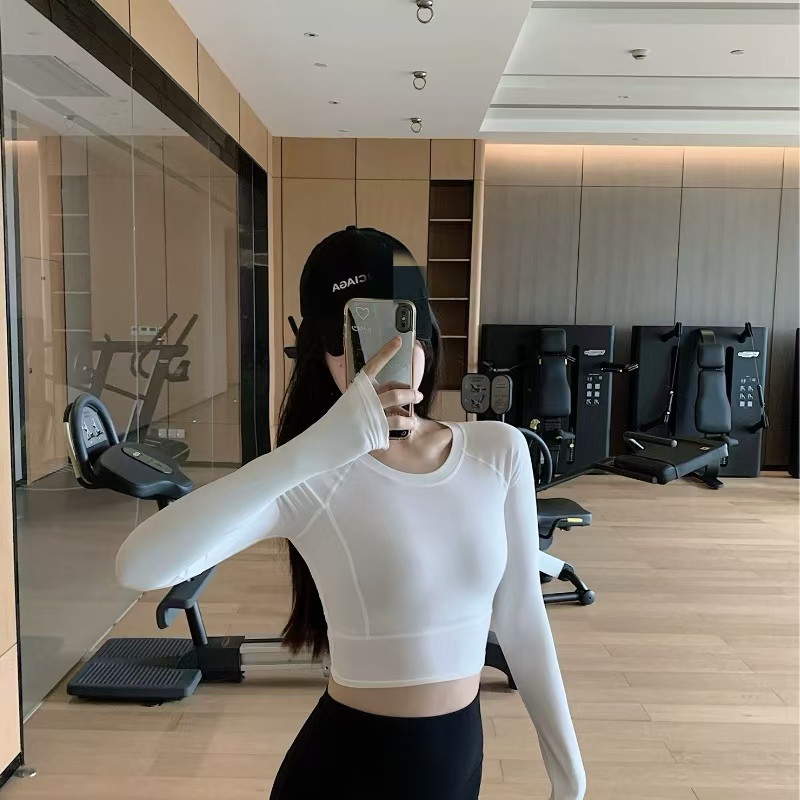 Amber健身长袖T恤女士时尚弹力短款露脐运动紧身跑步瑜伽服上衣