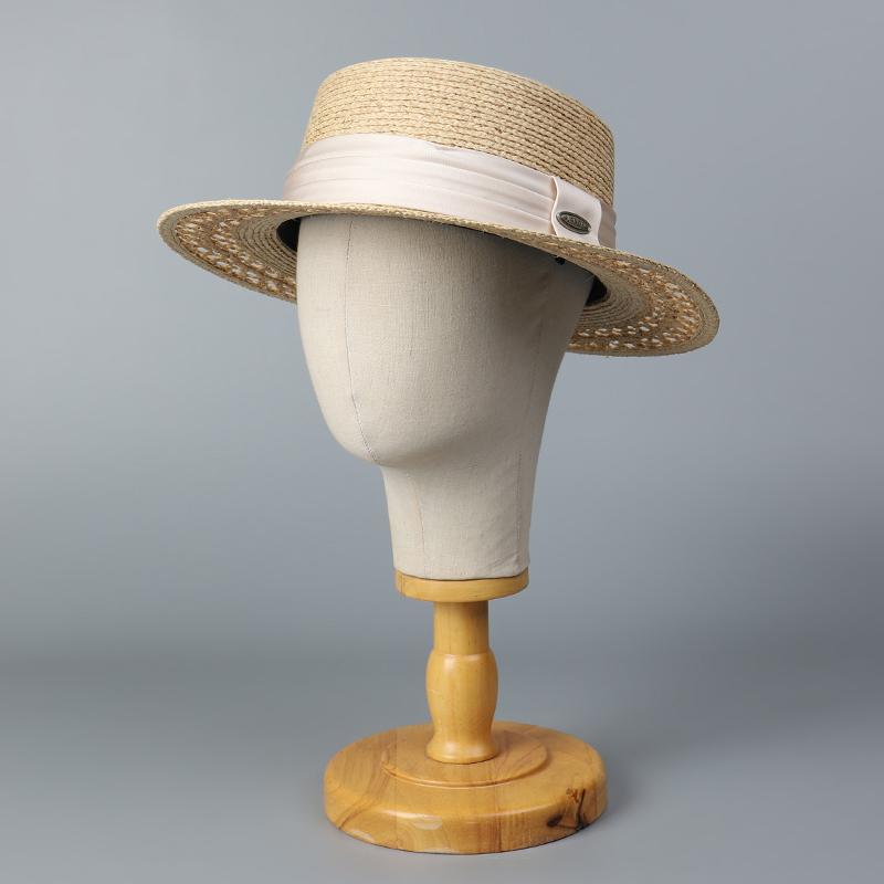 日系复古褶皱宽缎带平顶帽子女夏季防晒草帽赫本风时装帽百搭礼帽