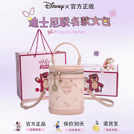 迪士尼印花水桶包发财桶女2025新款百搭圆筒包手提包单肩斜挎包