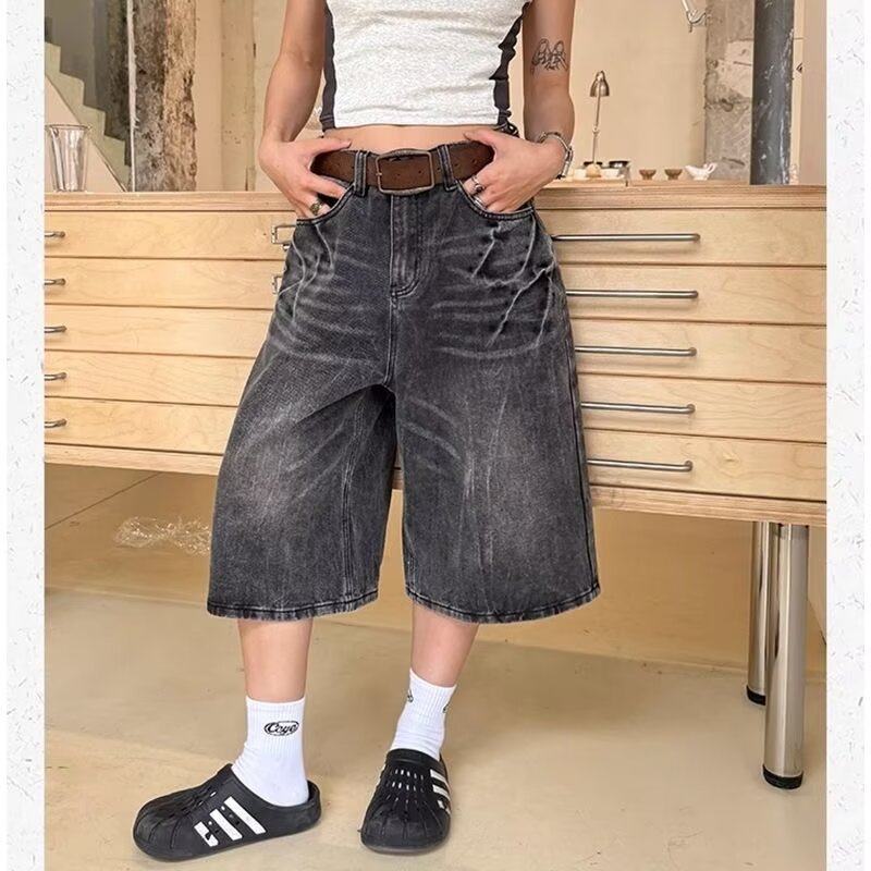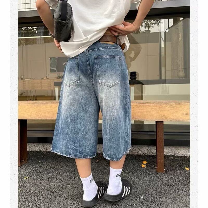 美式复古高街水洗闪电纹设计感牛仔裤男扎染潮流宽松阔腿七分裤子