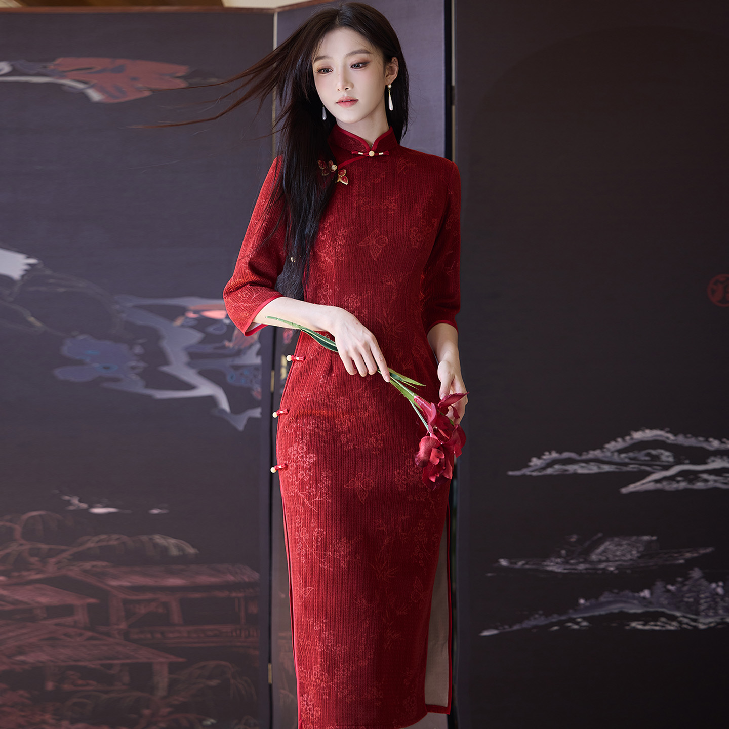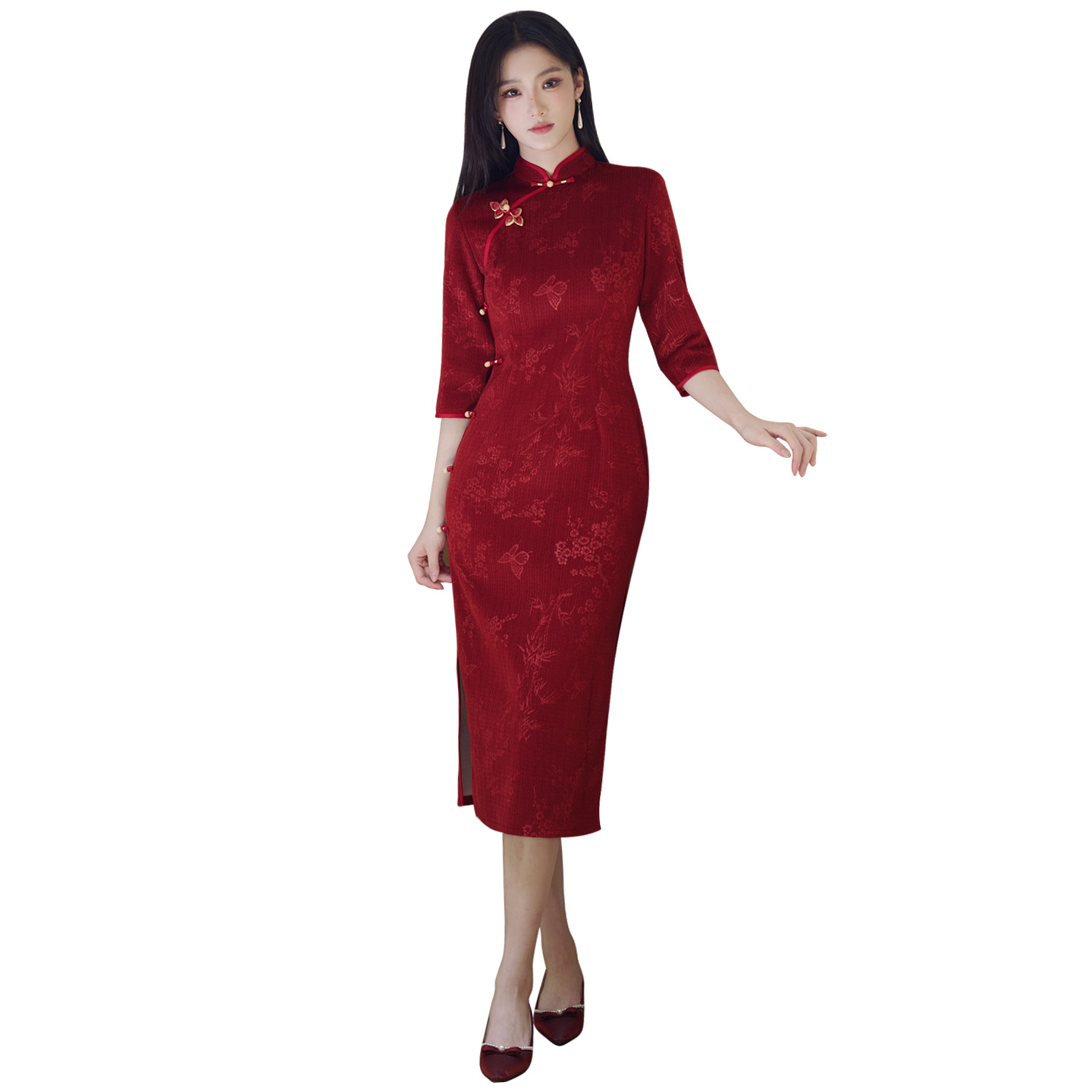 锦绒提花七分袖旗袍长款2025新款秋季红色喜妈妈婚宴礼服连衣裙