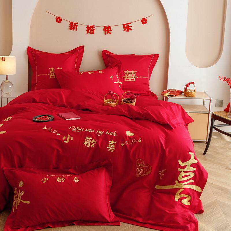 高档结婚四件套红色高级感刺绣被套陪嫁床单婚嫁喜被婚庆床上用品
