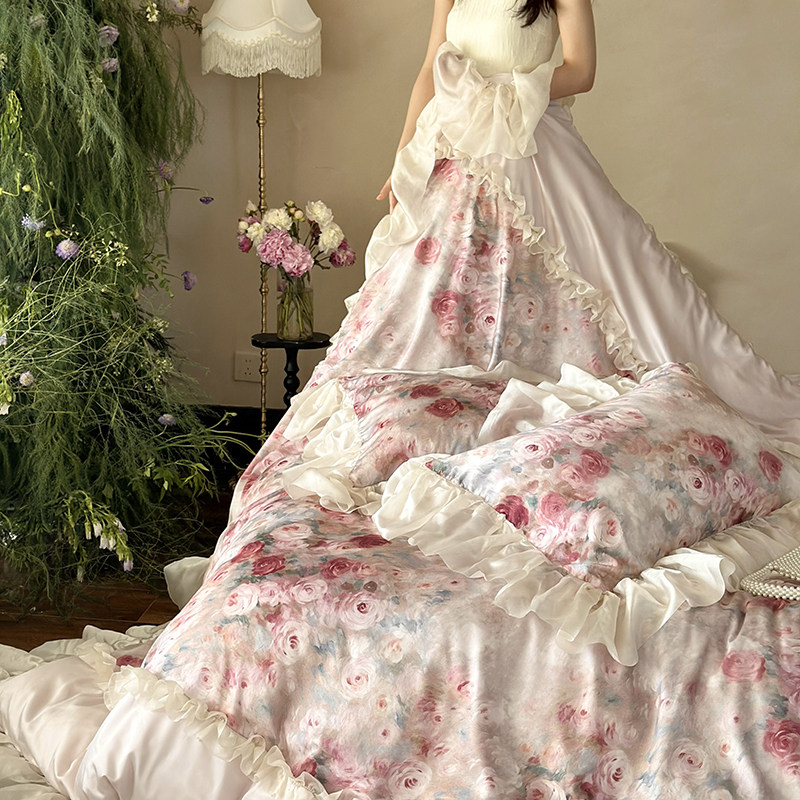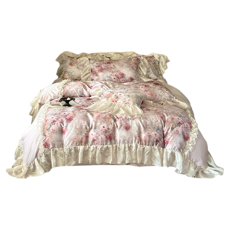 法式浪漫蕾丝边复古风120支长绒棉四件套全棉纯棉花卉被套床品4