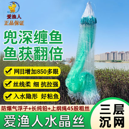 爱渔人水晶丝三层粘网加重鱼网渔网水库网鱼网粘网三层粘鱼网50米