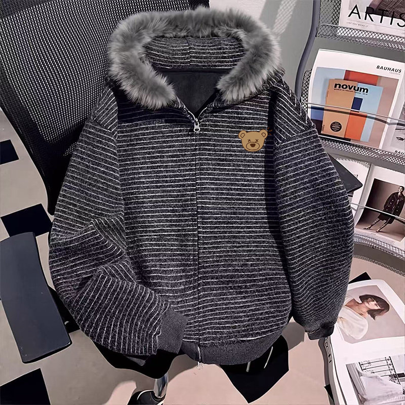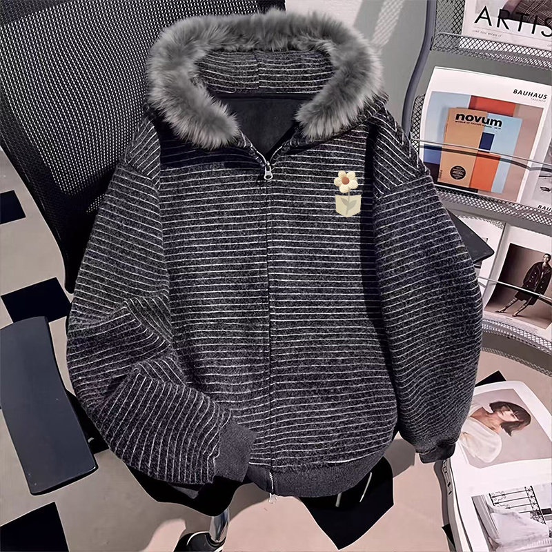 复古毛领连帽黑色条纹卫衣女小众设计感加绒加厚保暖秋冬季外套潮