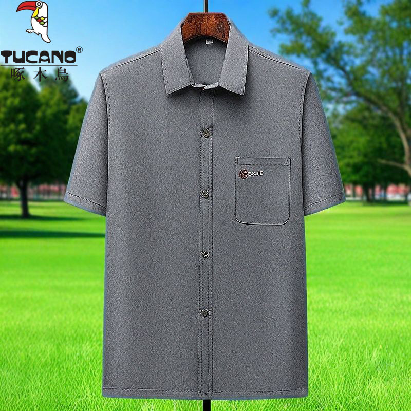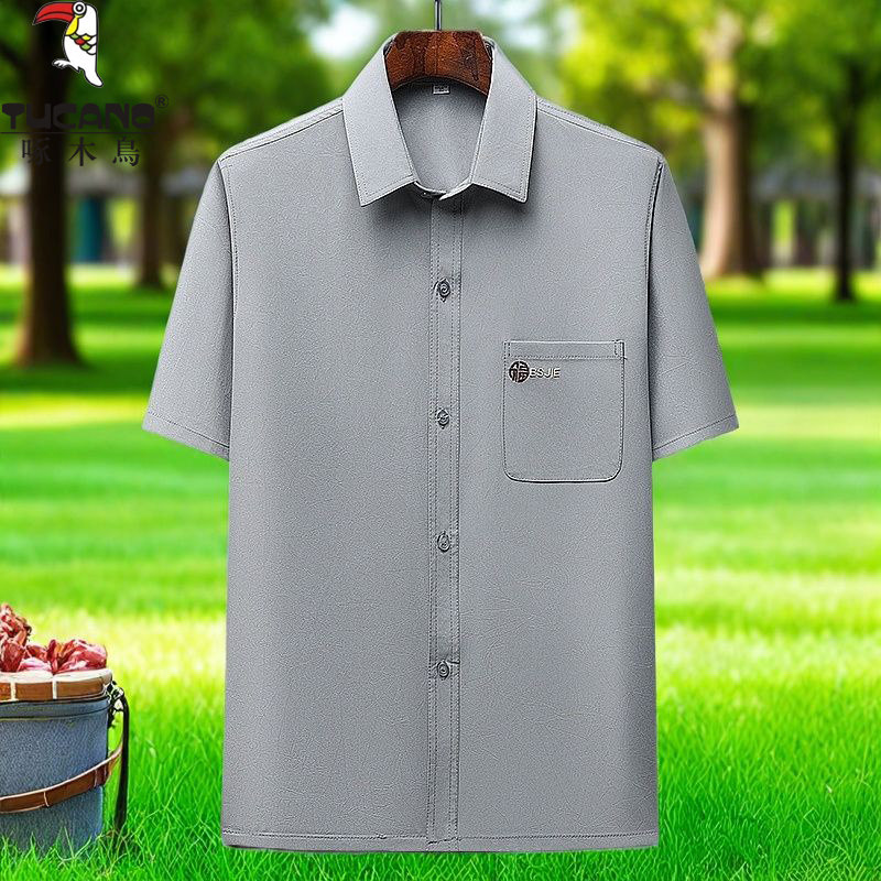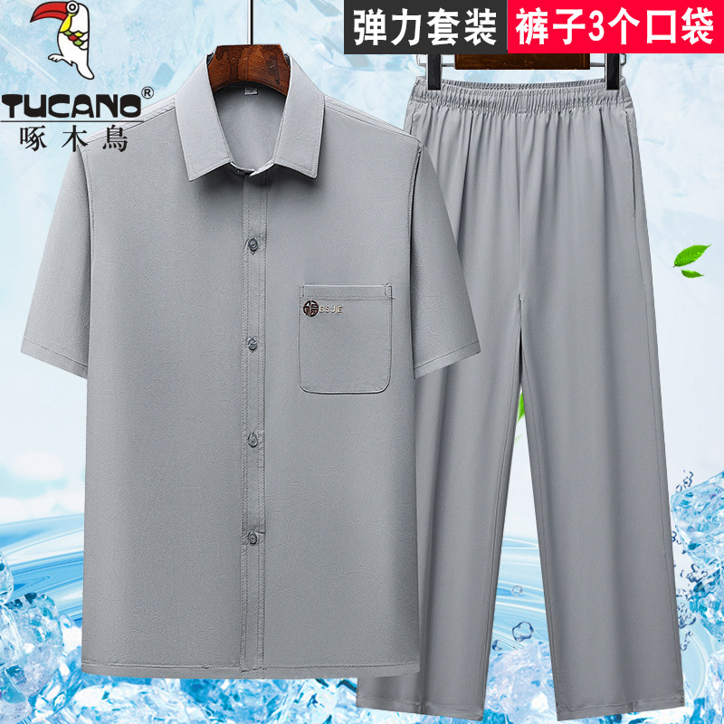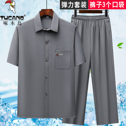 啄木鸟男士中老年冰丝短袖衬衫夏季中年衬衣爸爸宽松夏装爷爷套装