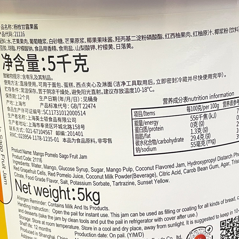 英士顿桶装上海果酱杨枝甘露果馅